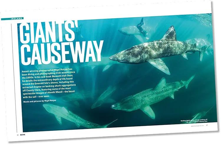 Award-winning photographer Nigel Motyer has been diving and photographing Irish waters for more than 40 years. We feature an extract from his new book, Beneath Irish Seas, with some of the most spectacular photographs of basking sharks we’ve ever seen.