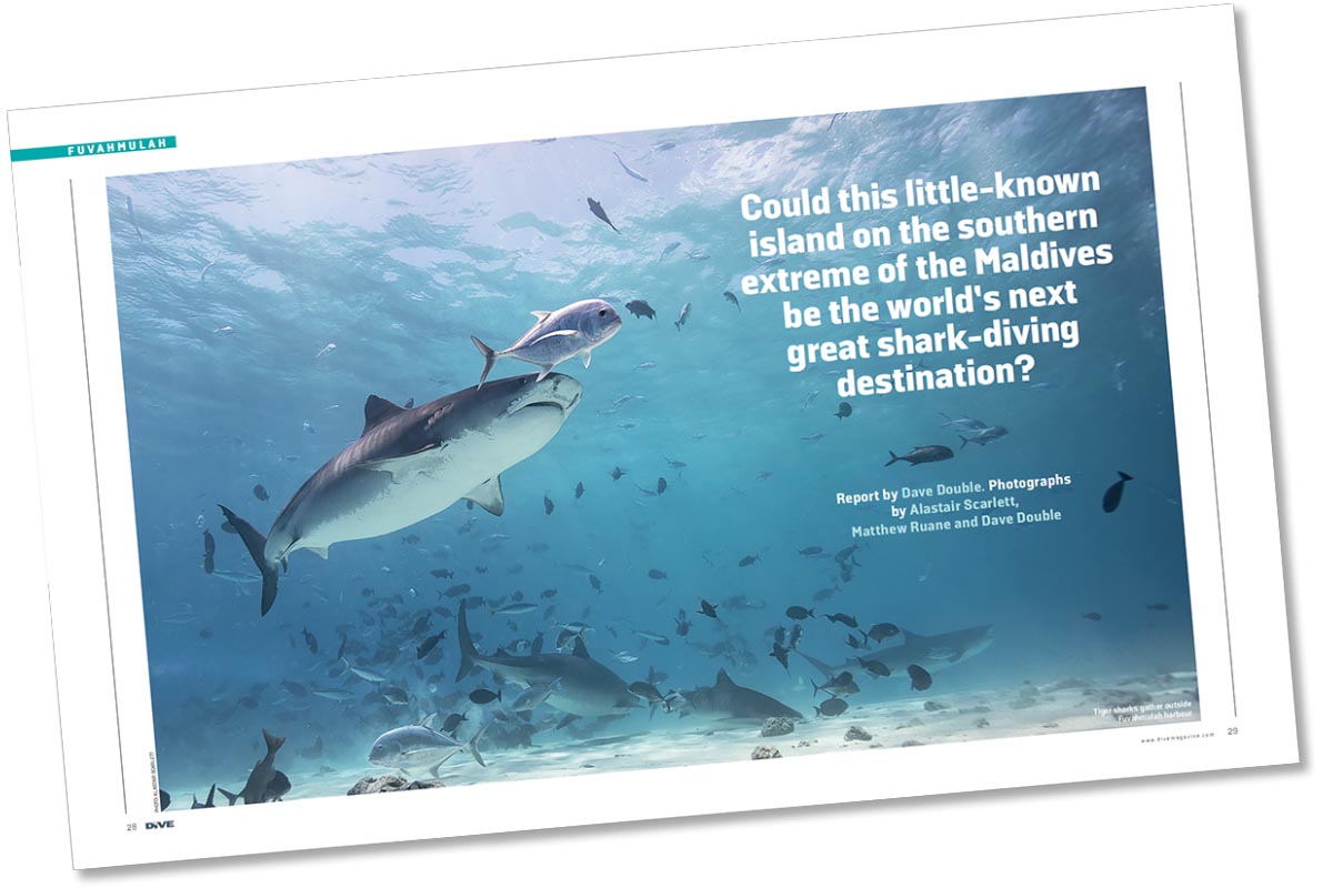 Very few people outside of the Maldives will have ever heard of Fuvahmulah, even if it is one of the most populous islands in the Maldives – but this is about to change. Home to a tuna fishery whose age is measured in centuries, it has also attracted a huge population of tiger sharks, particularly pregnant matriarchs who gather to feed on discarded fish before pupping. David Double reports from behind the lens on how it feels to be surrounded by tigers, with added photography by Alastair Scarlett and Matthew Ruane.