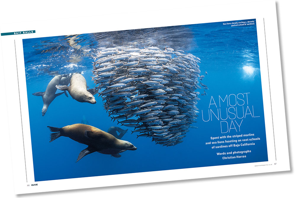 What does a normal day diving involve? Generally not watching a pack of striped marlin, sea lions and dolphins chasing huge schools of fish - unless you happen to be diving in Baja Magdalena for the sardine run during October and November. Christian Horras spent a most unusual day underwater dodging marlin spikes, and reports on the experience with some phenomenal imagery.