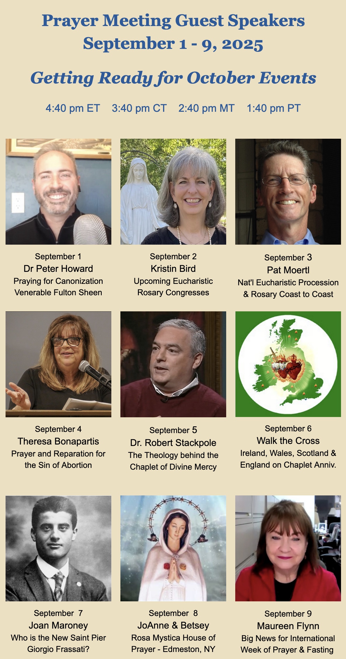 A lot is going on this month, and as we prepare for several significant events in October and beyond, we have a great lineup of speakers again to help you get ready! Details are below as well as the September novena prayers.