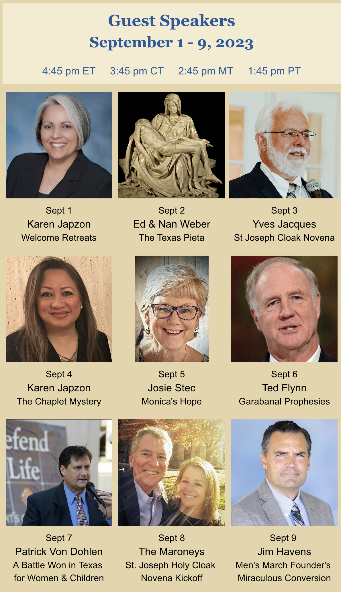 We invite you to take part in the St. Joseph's Holy Cloak Novena. We will kick off the 30 day novena on September 8, in honor of the Blessed Mother's birthday and conclude October 7, the Feast of Our Lady of Victory and the same day the 54-Day Rosary Novena for Our Nation concludes. Click on the message below to learn more and stay tuned for more information coming soon. In the meantime, click here for the prayers that may be found on the Divine Mercy for America resource page.