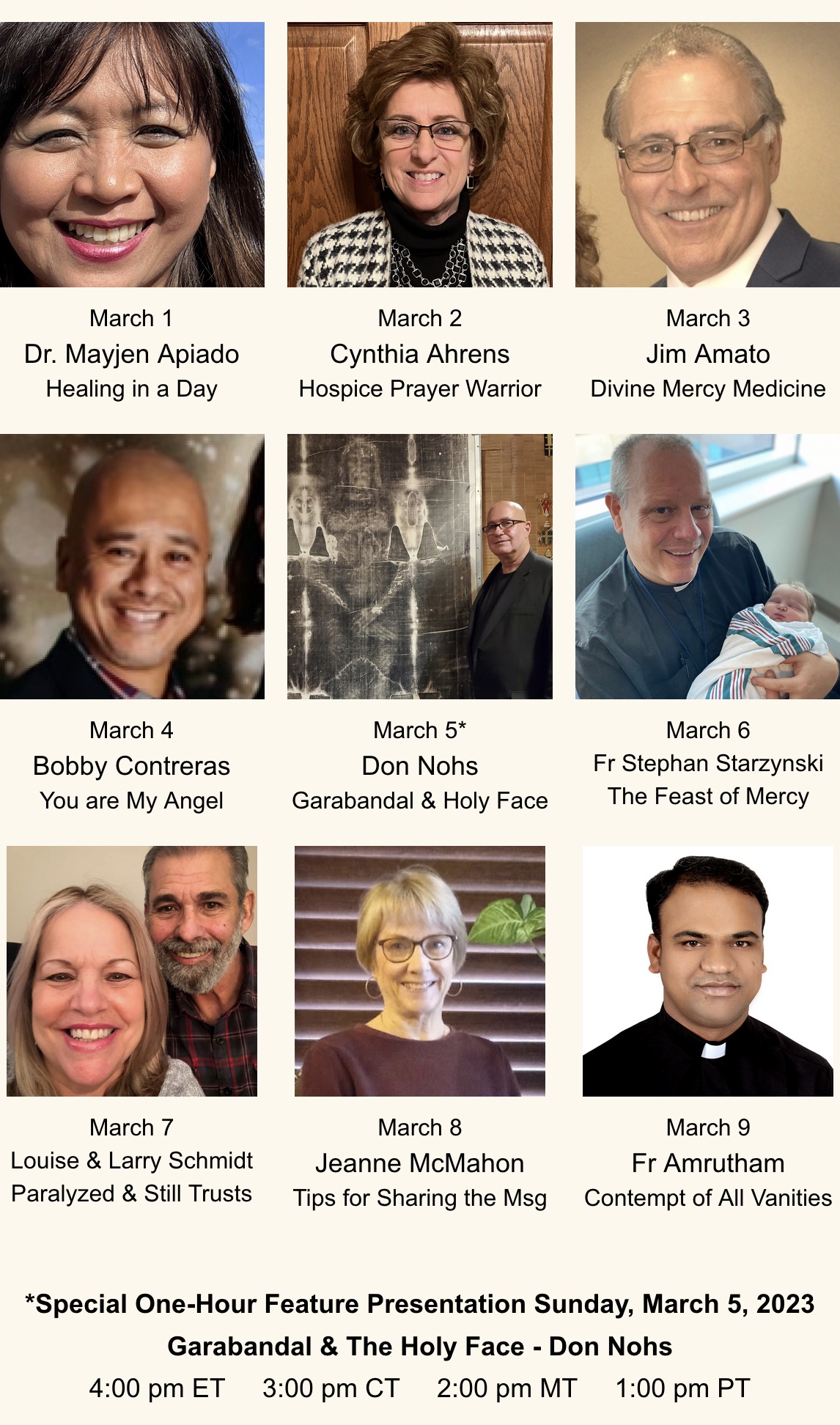 5:00 ET 4:00 CT 3:00 MT 2:00 PT 1. ZOOM-in Live on a computer, tablet, or phone by clicking the button or link below. | | https://us02web.zoom.us/j/77604590386 The same Zoom Link is good for each day of the novena. 2. Call-in on Your Phone for Live Event You will be prompted to enter the Meeting ID: 776 0459 0386 You will be prompted to enter the Participant ID. There is no Participant ID. Just enter the # symbol. Usually available by 8 pm EDT |