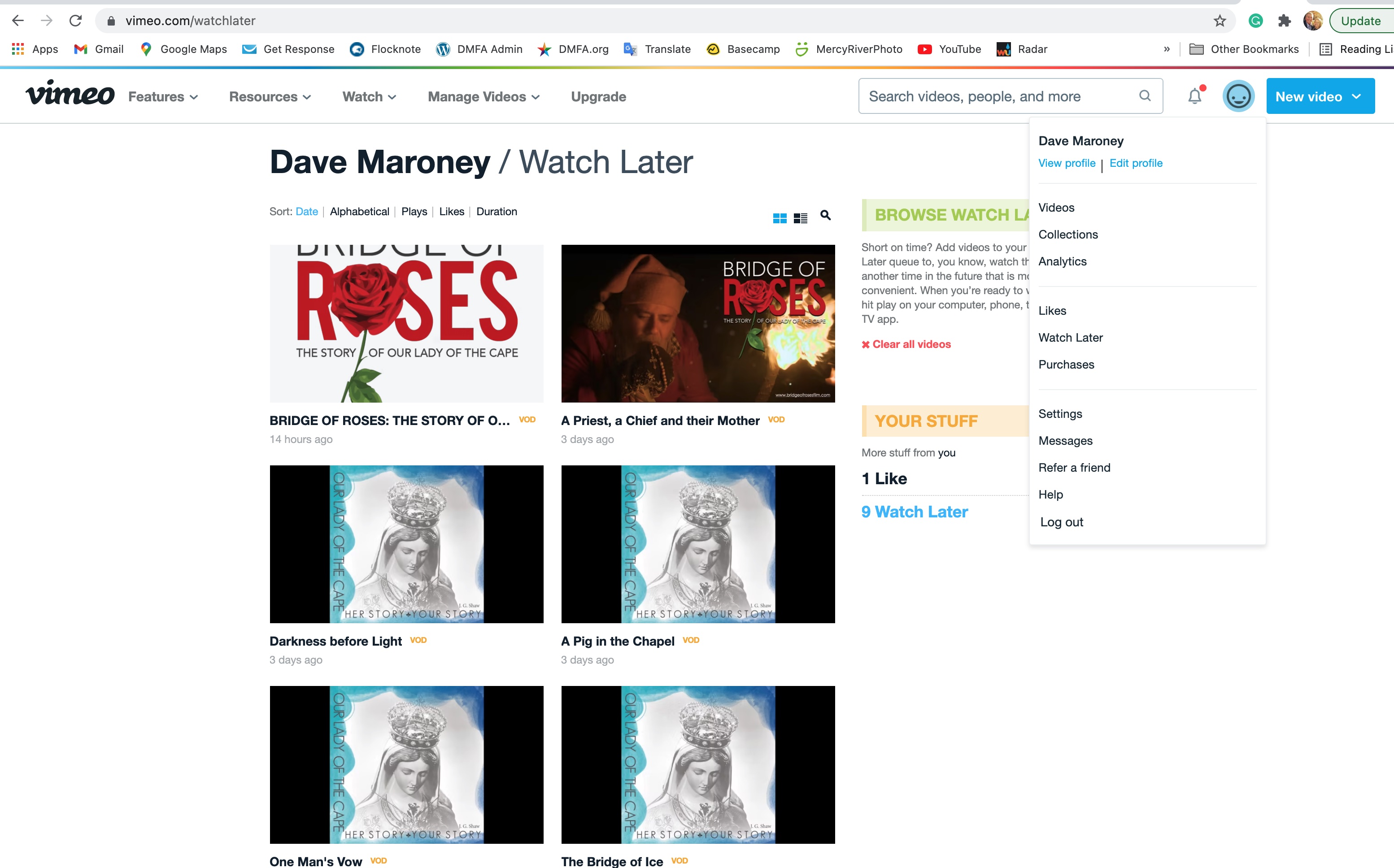 It will also be in 'Purchases' but you will need to scroll down to find the movie. Look for BRIDGE OF ROSES: THE STORY OF OUR LADY OF THE CAPE 1:10:58. It is #9 on my list.