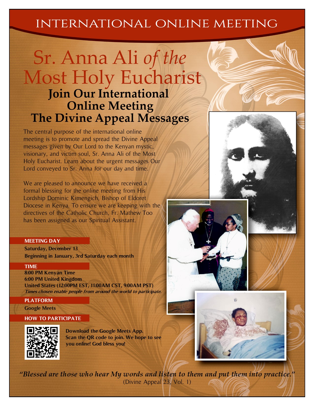 Divine Appeal Messages Meeting Saturday, December 13, 2025 | | We have been privileged to help our friends Greg and Sharon Amaya of Mary Our Mother Foundation publicize the life and mission of Kenyan Mystic and Stigmatist Sr. Anna Ali of the Most Holy Eucharist. As He did with St. Maria Faustina, Jesus asked Sr. Anna to record His urgent messages to humanity, known as "The Divine Appeal." Sister Anna died in June 2012. Her cause for canonization is progressing, as is that of the bishop who guided her, Cornelius K. Arap Korir. Mary Our Mother Foundation has received approval and blessing from Bishop Kimengich of Eldoret, Kenya, to conduct a monthly online meeting to spread the Divine Appeal Messages. The first meeting is on Saturday, December 13, 2025, via Google Meet. Download the app if you don't already have it. Then all you have to do is click the link: https://meet.google.com/rms-amnp-dqe We have been deeply touched by Sr. Anna Ali and the Divine Appeal messages and believe you will be as well. Please try to join us for this historic international meeting. It's a great Advent activity. Your Mother of Mercy Messengers | |