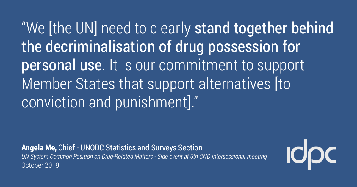On 16 October 2019, a senior official of the United Nations Office on Drugs and Crime (UNODC) gave a clear statement endorsing the decriminalisation of drug possession for personal use. This statement was part of a wider common position adopted by the Chief Executives Board of the UN (CEB), consisting of 31 UN agencies.