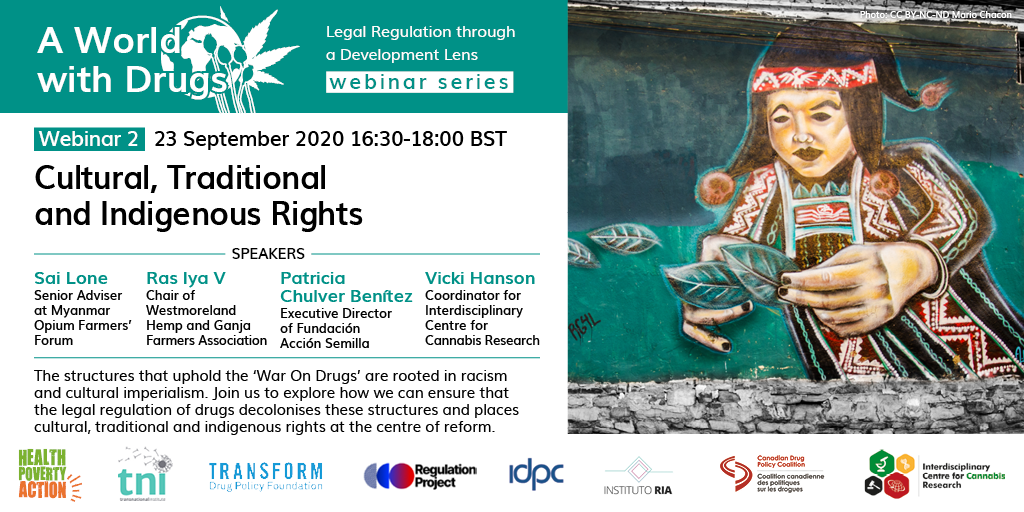 We are delighted to invite you to the second webinar of 'A World with Drugs' series, on Cultural, Traditional, and Indigenous Rights, organised in collaboration with Health Poverty Action, International Drug Policy Consortium, Transform Drug Policy Foundation, Canadian Drug Policy Coalition, Instituto RIA, and Interdisciplinary Centre for Cannabis Research. Register to receive more details.