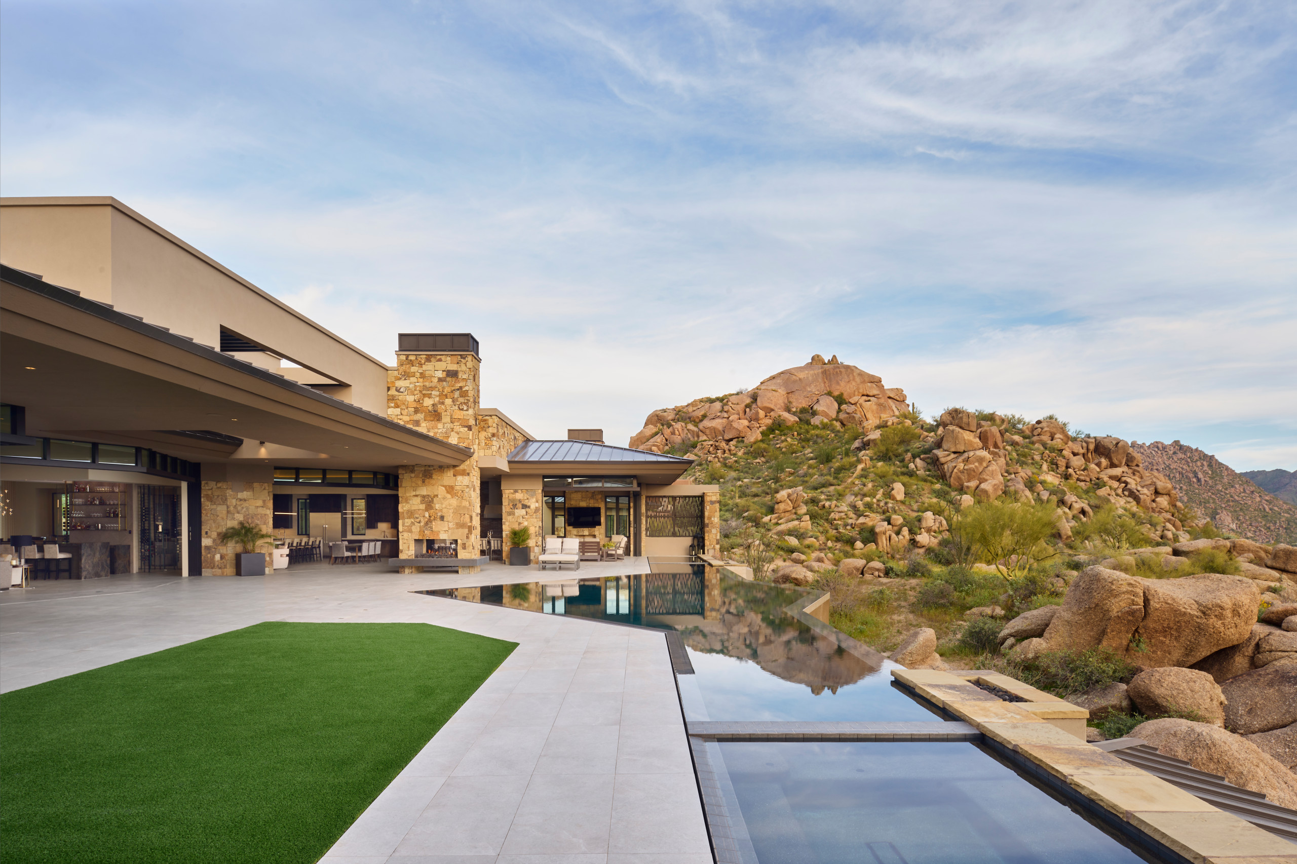 Architectural Brilliance in the Desert Spanning 5,600 square feet, the five-bedroom, six-bathroom home was masterfully designed to merge nature with structure. Its steel and concrete exterior gives way to an interior of marble, stone, and glass, where 20-foot ceilings and oversized windows fill the home with natural light.