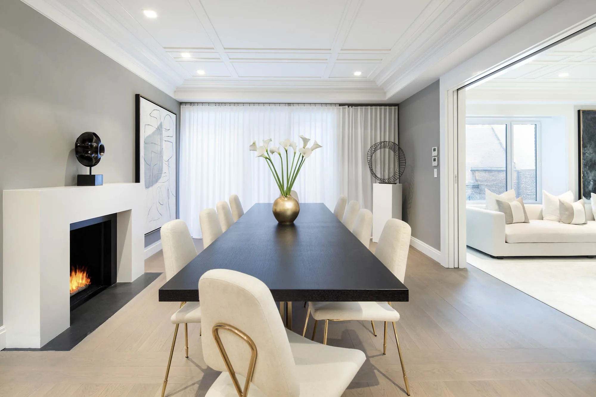 Sophisticated Interiors with Impressive Features The triplex features soaring ceilings, reaching up to 39 feet in some areas, and floor-to-ceiling windows that fill the home with natural light. The main level is designed for both comfort and style, with an open-plan living room, a formal dining area, and a great room complete with a wet bar and fireplace. The custom Molteni & C Dada kitchen boasts premium finishes, including Statuario marble countertops, Gaggenau appliances, and brass fixtures by Fantini.