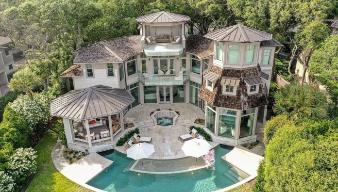 Opulent Design with Global Influence Every detail of this home reflects meticulous craftsmanship and international influences. The home features 11,050 square feet of living space, including seven bedrooms and nine bathrooms. Imported materials such as Italian Porphyry cobblestones and Bodega limestone-clad porticos contribute to the estate’s timeless elegance.