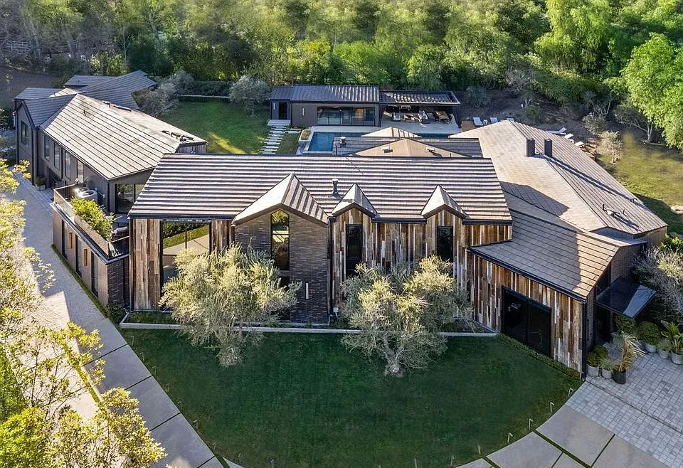 A Modern Marvel for Entertaining and Relaxation The residence boasts seven spacious bedrooms and eight bathrooms, with the home's exterior crafted from reclaimed wood and charcoal-hued brick, giving it a distinctly masculine and modern appeal. Upon entering, visitors are greeted by soaring 40-foot ceilings and exposed steel beams, creating an expansive sense of space. The great room, which serves as the heart of the home, features panoramic windows that flood the interior with natural light and provide seamless access to the outdoor patio.