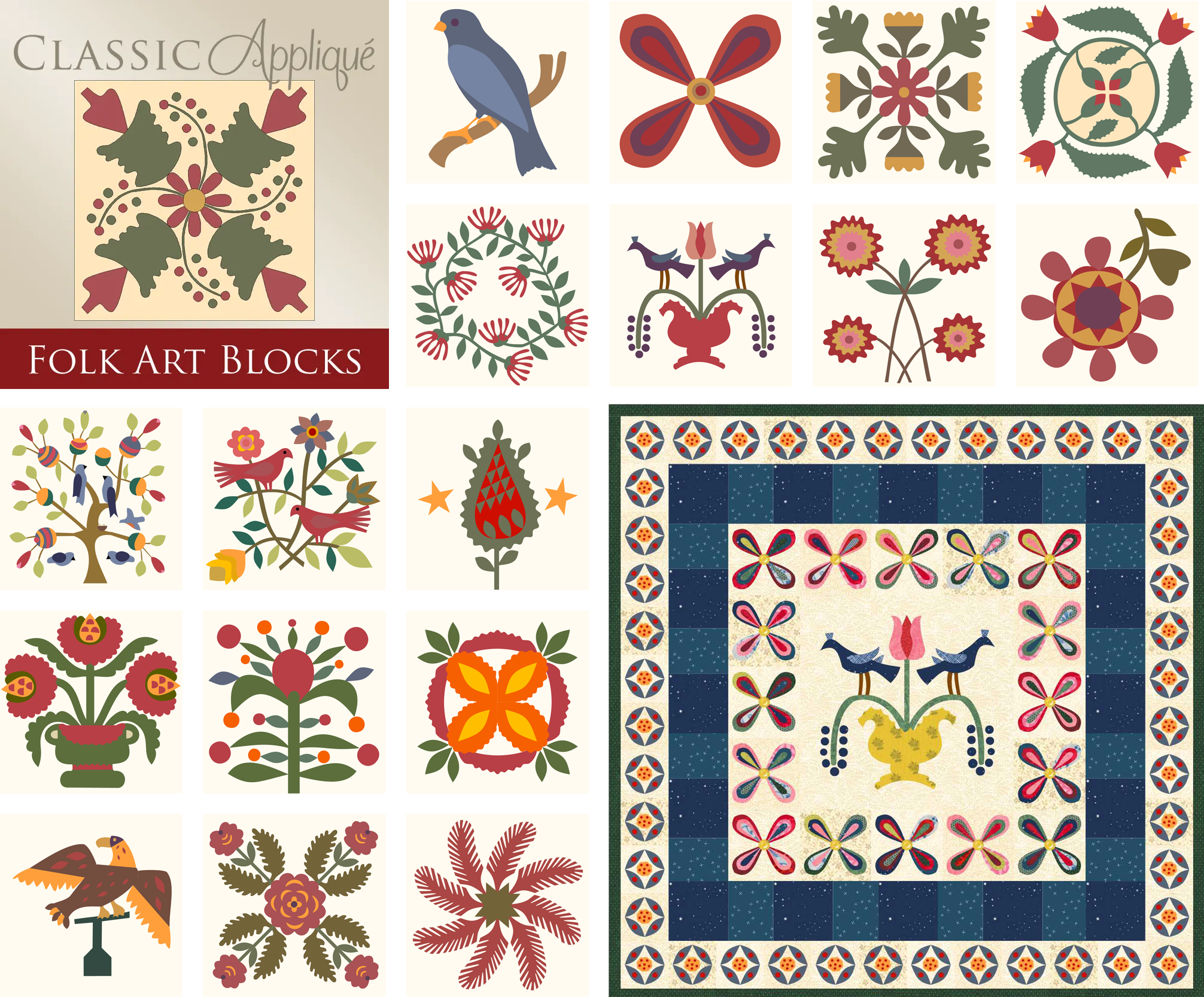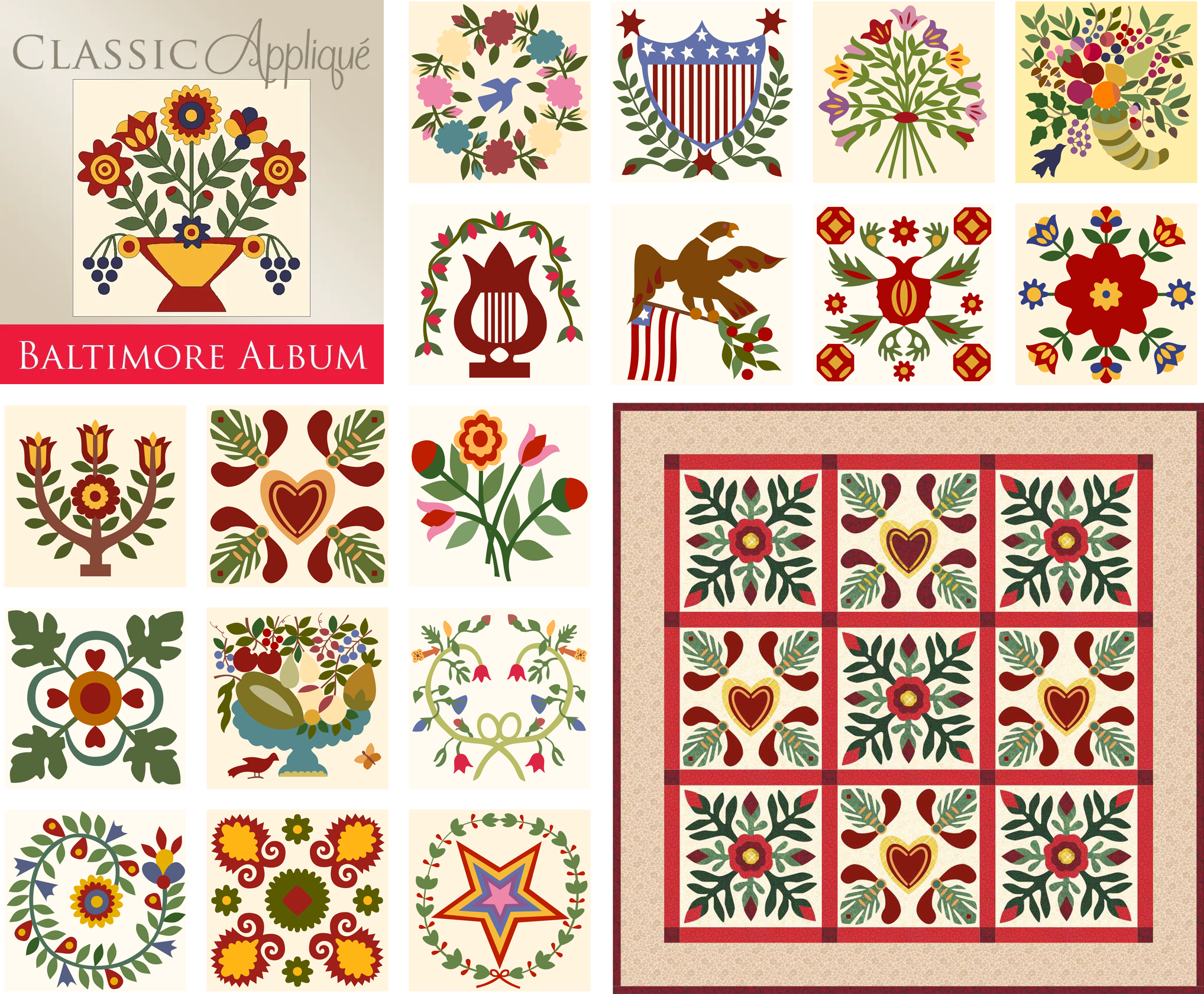 Baltimore Album Discover the magic of rare, ornate quilts! These stunning blocks, often framed with bold red sashing, were once gifted treasures, complete with mottos and handwritten signatures. Now you can stitch your own piece of history! More details > |
