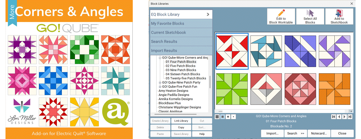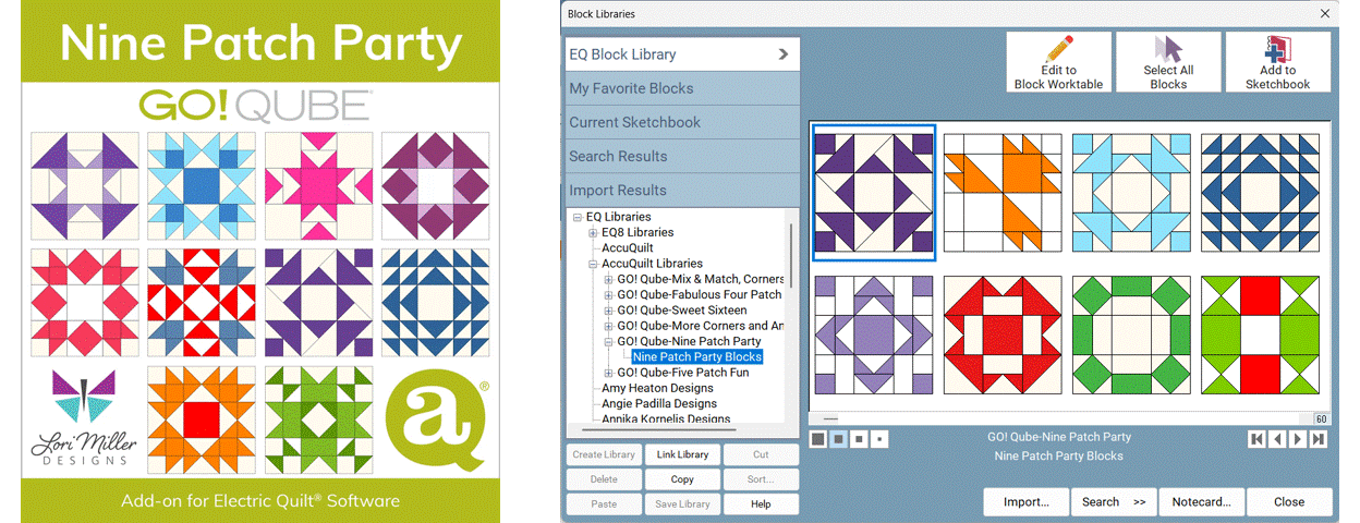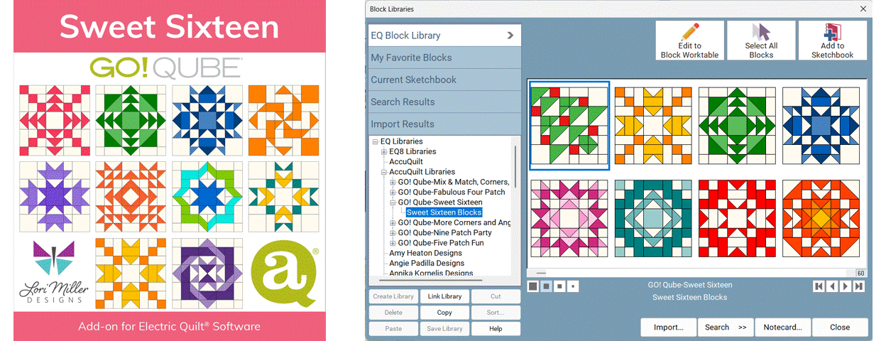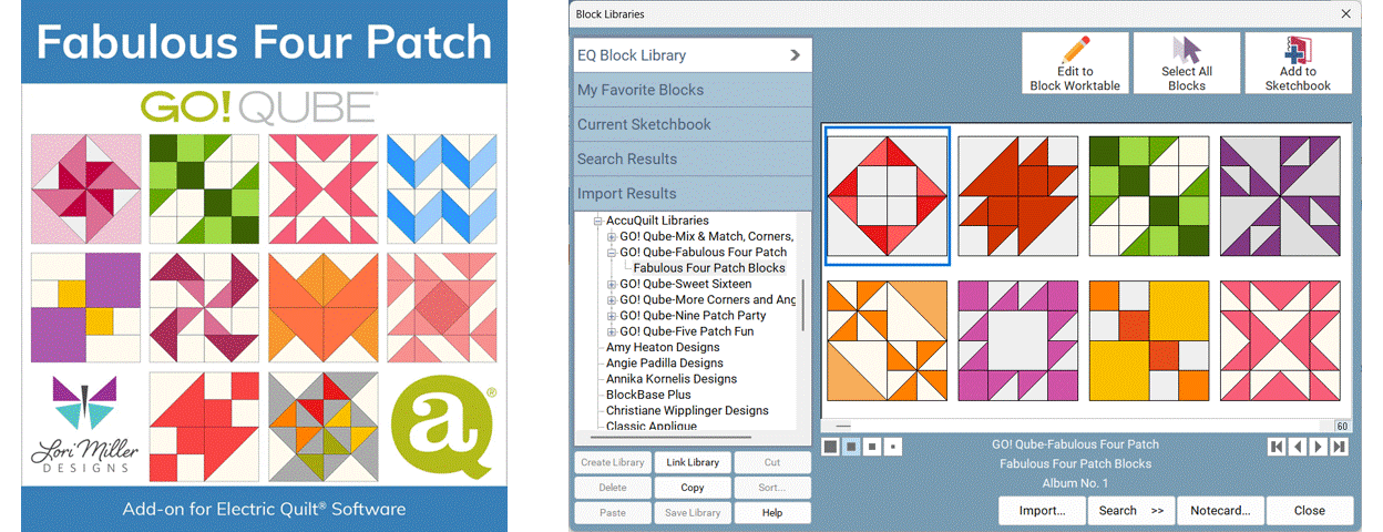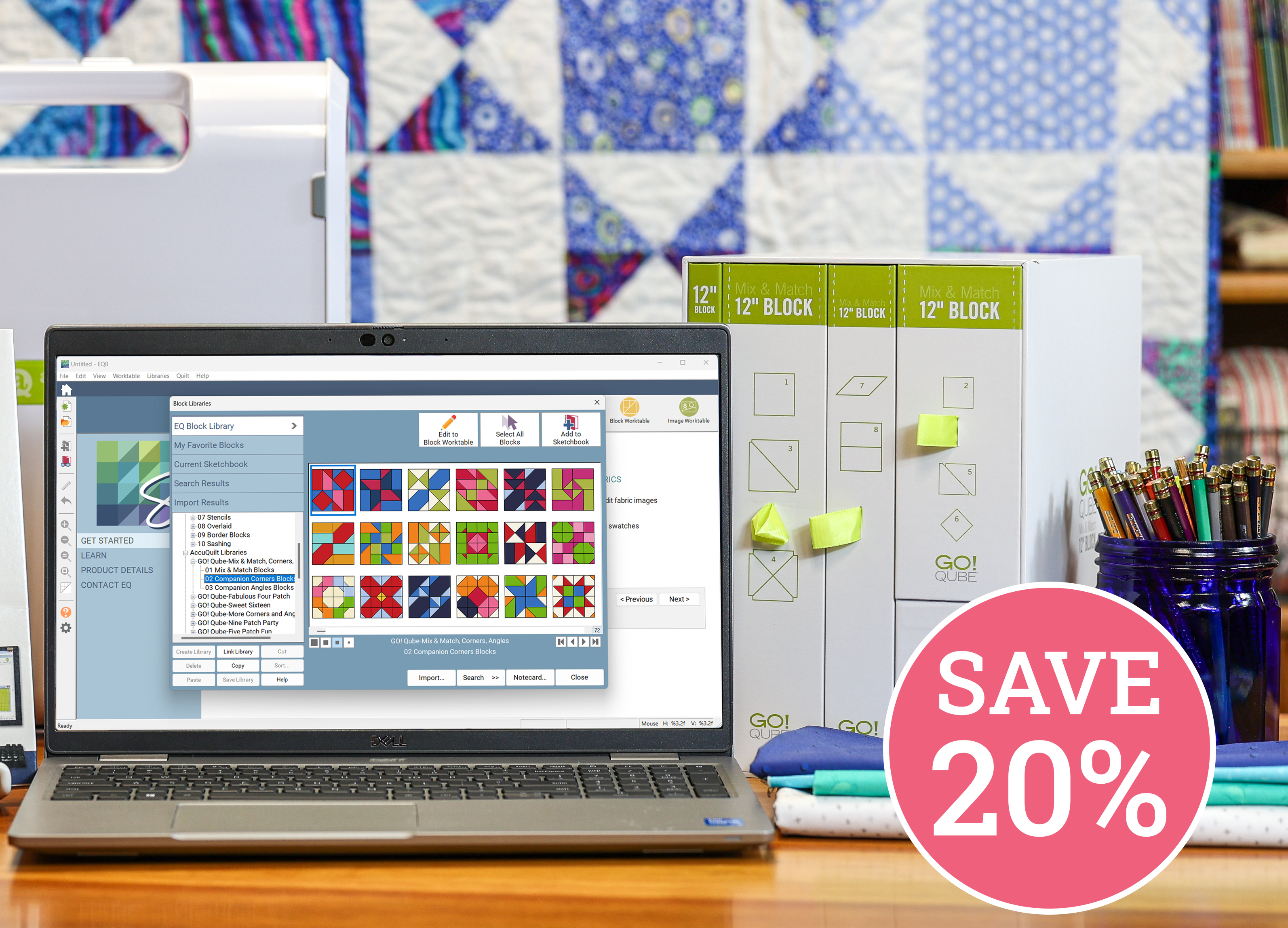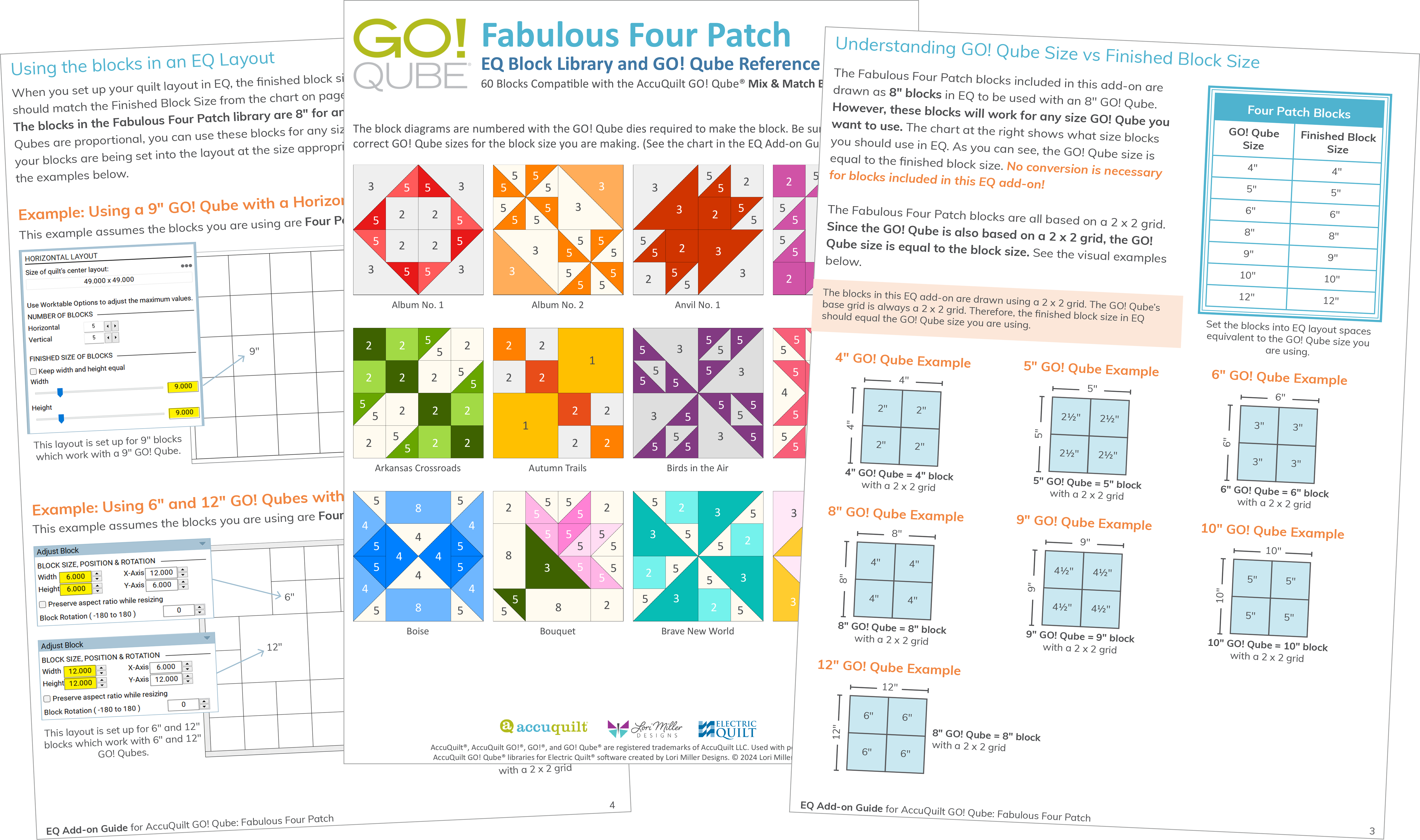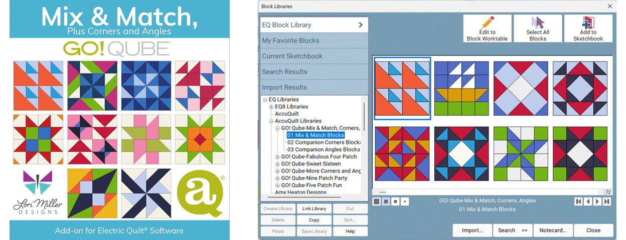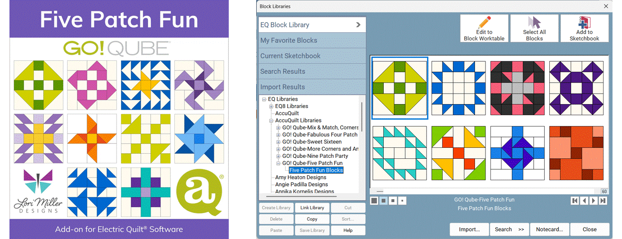 Add hundreds of blocks to EQ8 with these add-ons. Design quilts, audition fabrics, then use your AccuQuilt GO! Qube to cut the patches. No measuring required! |