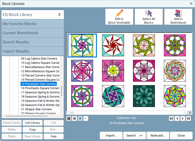 Imagine what you could make with 1,000+ kaleidoscope-style blocks! These are just a handful of Kaleidoscope Collection Two blocks made by talented EQ users (maker details here).