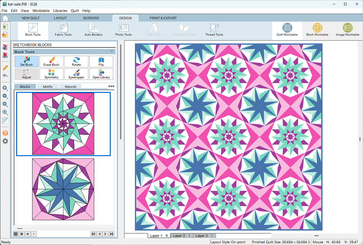 STEP 2: DESIGN A PROJECT Set up your layout however you'd like. Modify the style, block size, borders, and other settings. Then set your block(s) in the quilt and color.