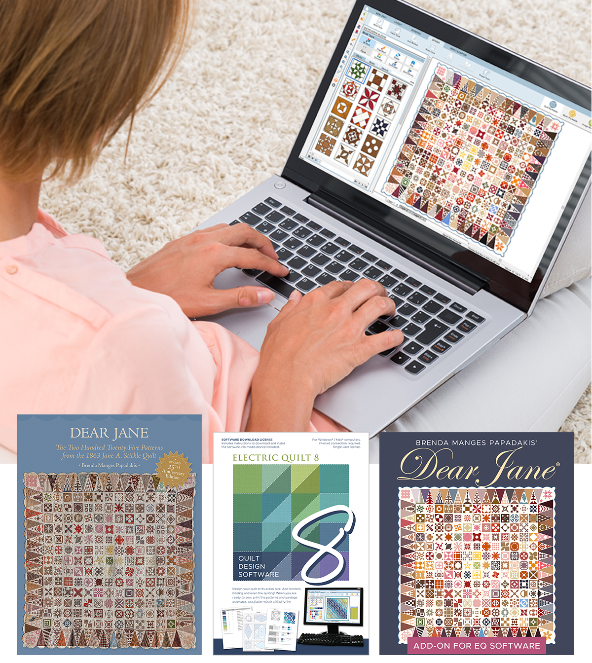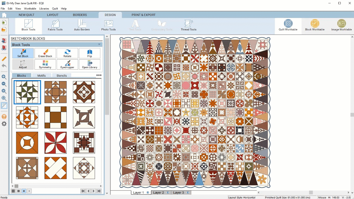 25% off EQ8 & Dear Jane products!Don’t sit there tracing, drafting and re-drafting the Dear Jane blocks yourself; print them out directly from EQ8! The add-on includes all the quilt blocks (and border blocks, too!) to make the original sampler quilt, plus over 330 more! That’s a total of over 560 blocks that can be printed in any size. |