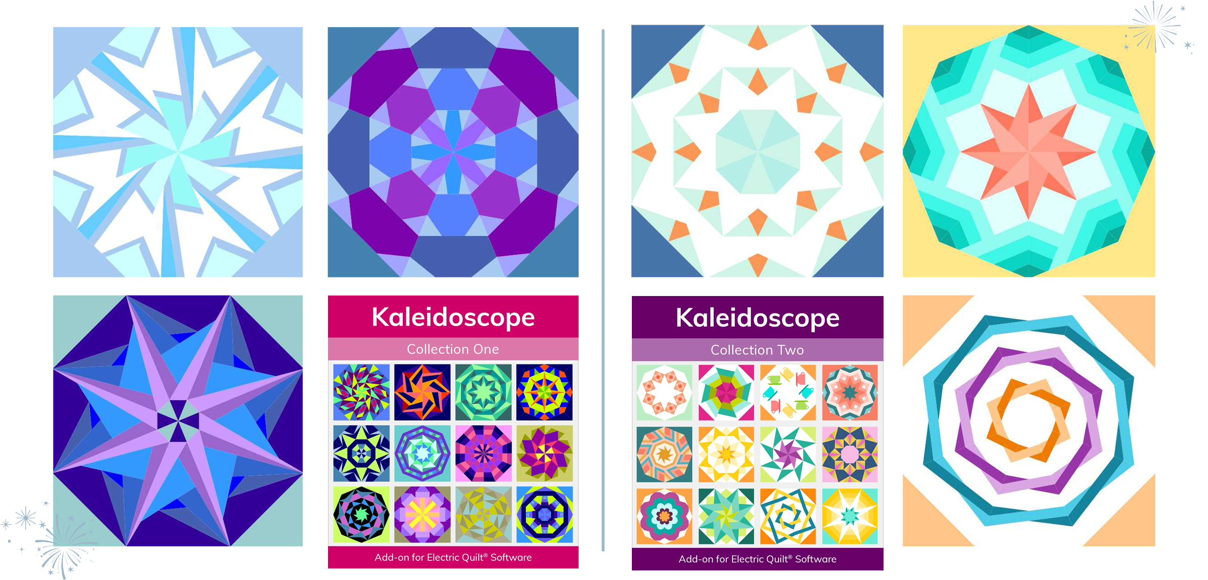 Kaleidoscope block add-ons!Add over 500 kaleidoscope-inspired blocks (with each add-on) to the EQ8 library and design quilts that sparkle like New Year’s fireworks. Mix, match, and customize endless combinations, then print foundation patterns at any size to bring your vision to life. Shop Kaleidoscope add-ons > |