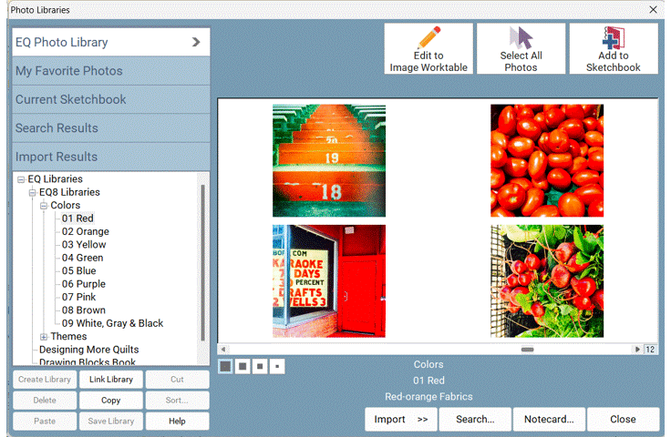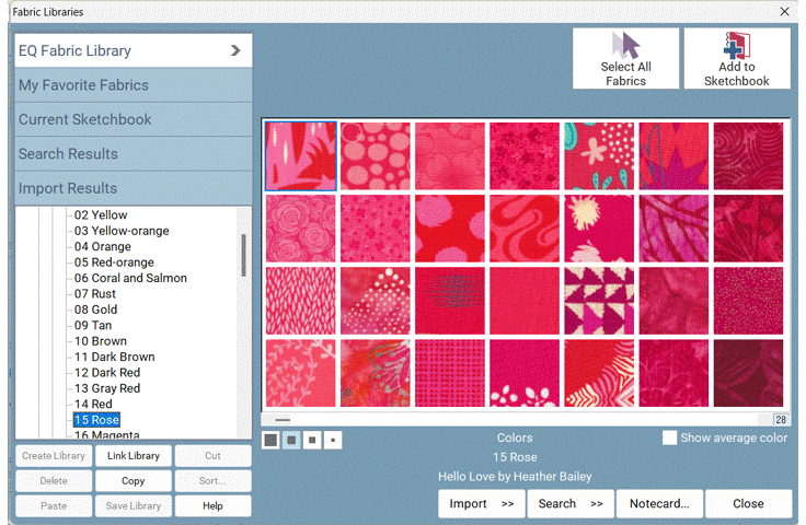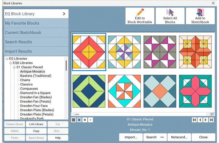 Updated Libraries! The Block Library has a total of 6,779 blocks. That’s over 1,000 blocks MORE than EQ7! The Block Library includes pieced, foundation, applique, motifs, stencils, border blocks, and more! Plus, the block colorings got a makeover so they look more modern and fresh! And don’t forget, you can change the view to see all the blocks in grayscale or as line drawings! |