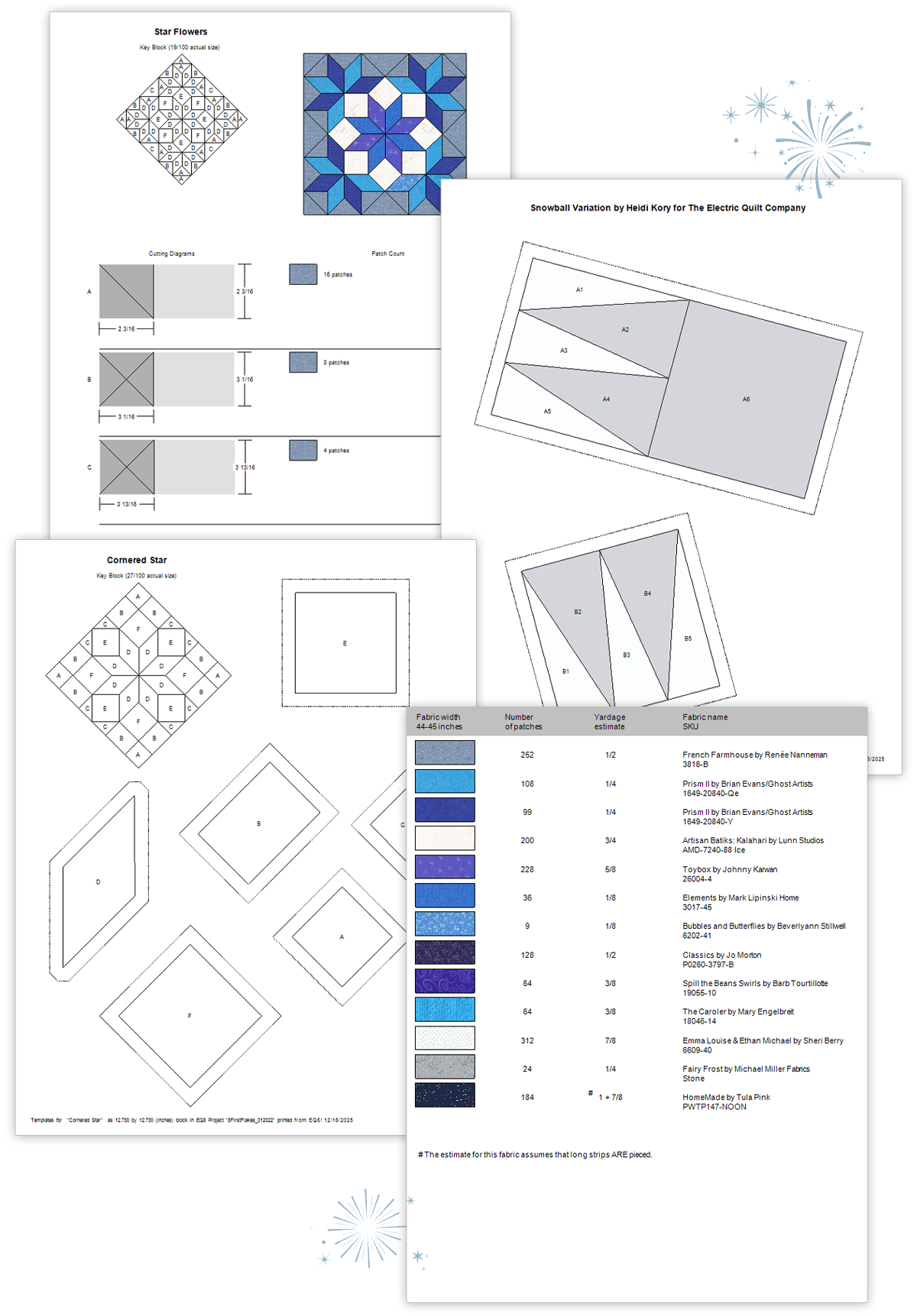 EQ8 uses the finished sizes you defined for the blocks and adds the seam allowance, where necessary. Then, you can print fabric estimates, templates, rotary cutting charts, and foundation paper piecing patterns!See more features >