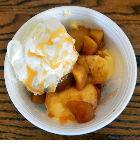 Stop by the Ice Cream & Candy Shoppe during First Friday to cool off with a fall sundae-- Vanilla ice cream topped with apple pie filling, salted caramel sauce, and whipped cream.
