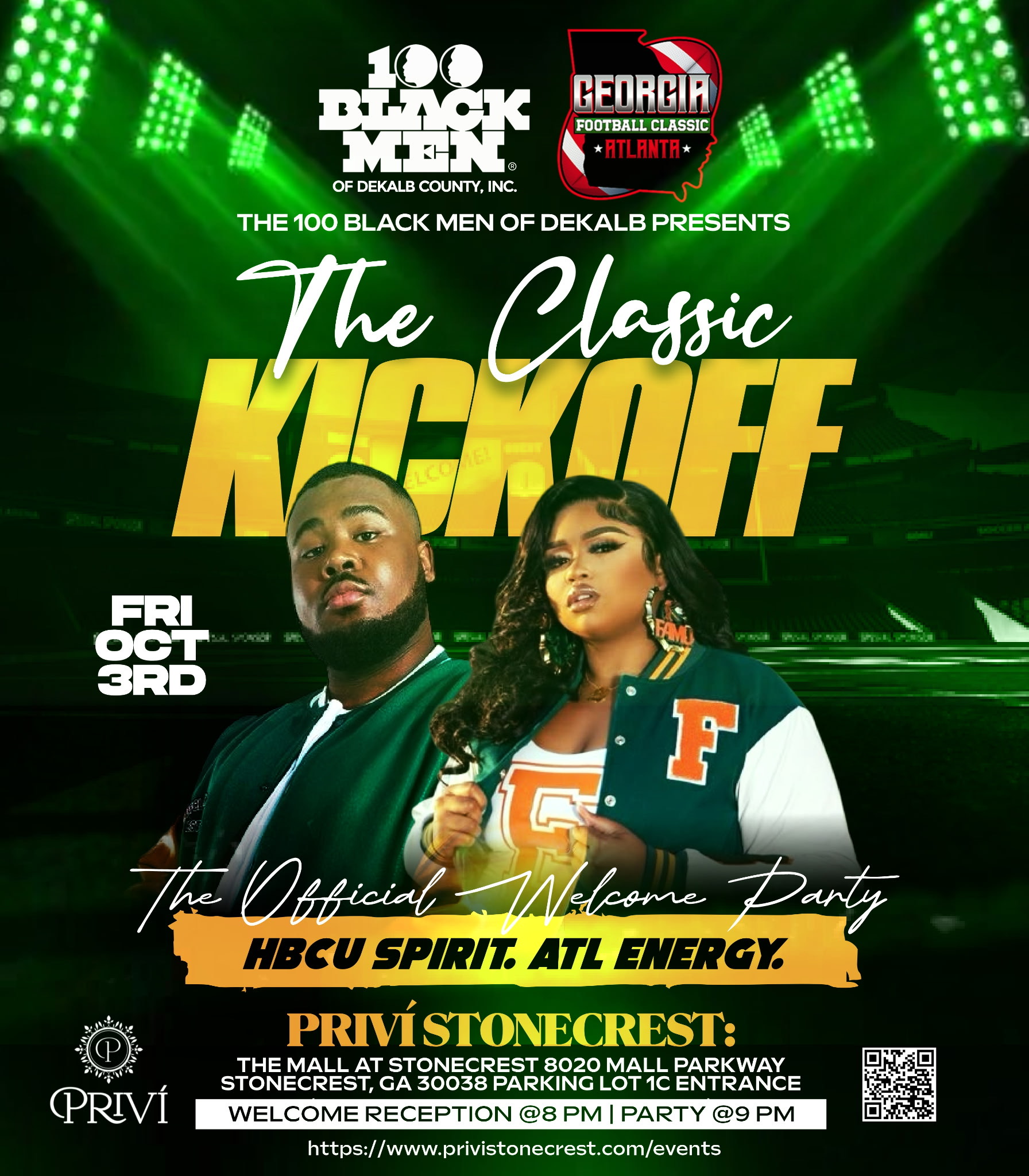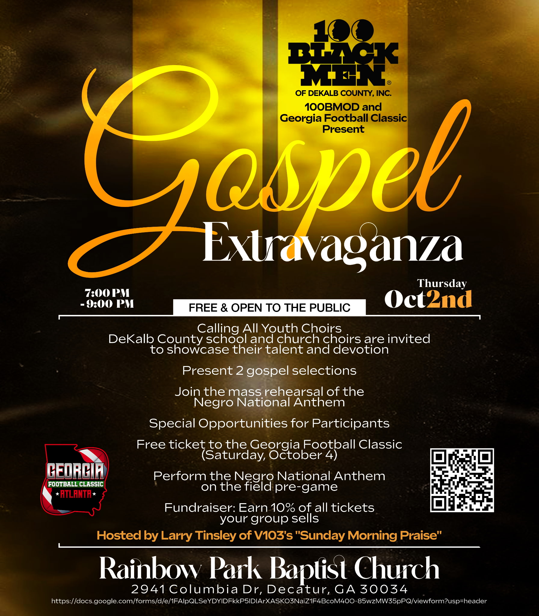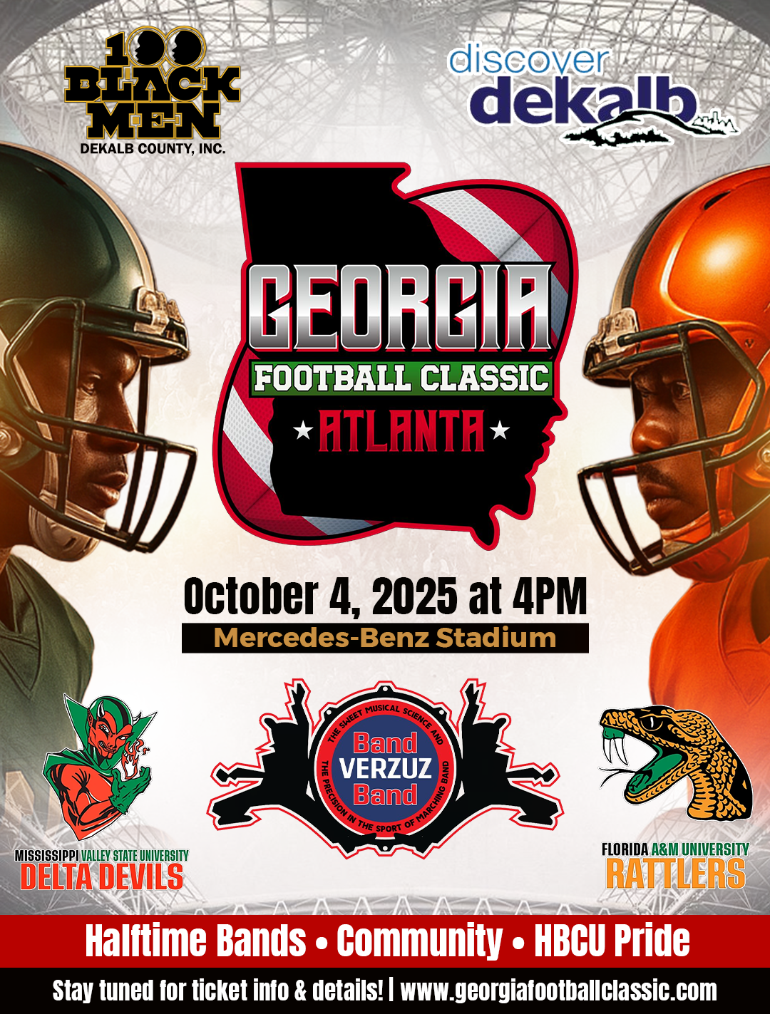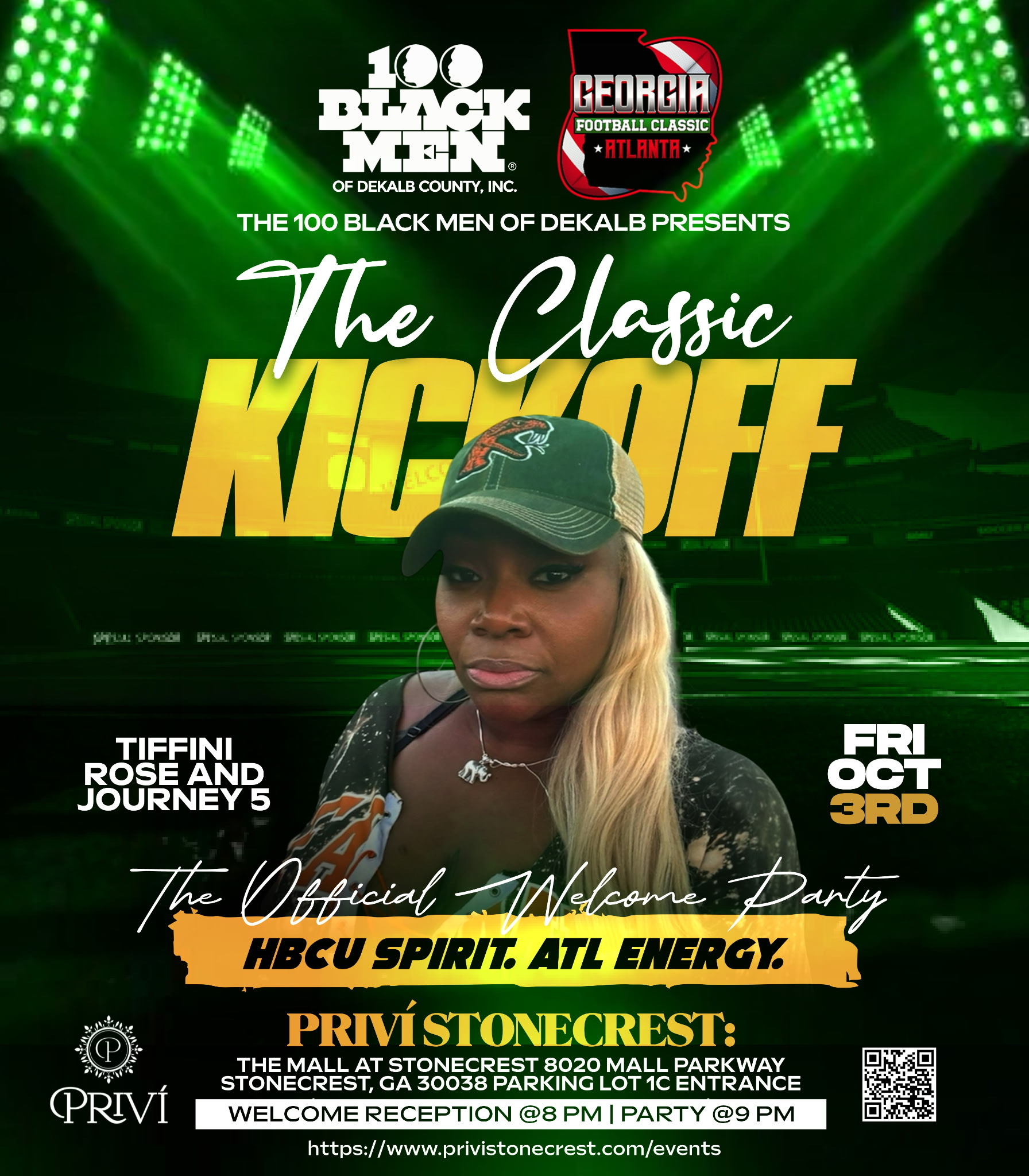 | | GEORGIA FOOTBALL CLASSIC WEEKEND | | FREE & OPEN TO THE PUBLIC HOSTED BY LARRY TINSLEY OF V103'S "SUNDAY MORNING PRAISE" @RAINBOW PARK BAPTIST CHURCH GOSPEL CHOIRS SIGN UP HERE | | | | | | | | THE OFFICIAL WELCOME PARTY FEATURING TWO PARTY ROOMS, LIVE MUSIC, AND DANCING! Live Music by Tiffini Rose and Journey 5 Acoustic Soul by Desmond Champion | | | | | GEORGIA FOOTBALL CLASSIC GAME & FLORIDA A&M VS MISSISSIPPI VALLEY STATE! | | | |