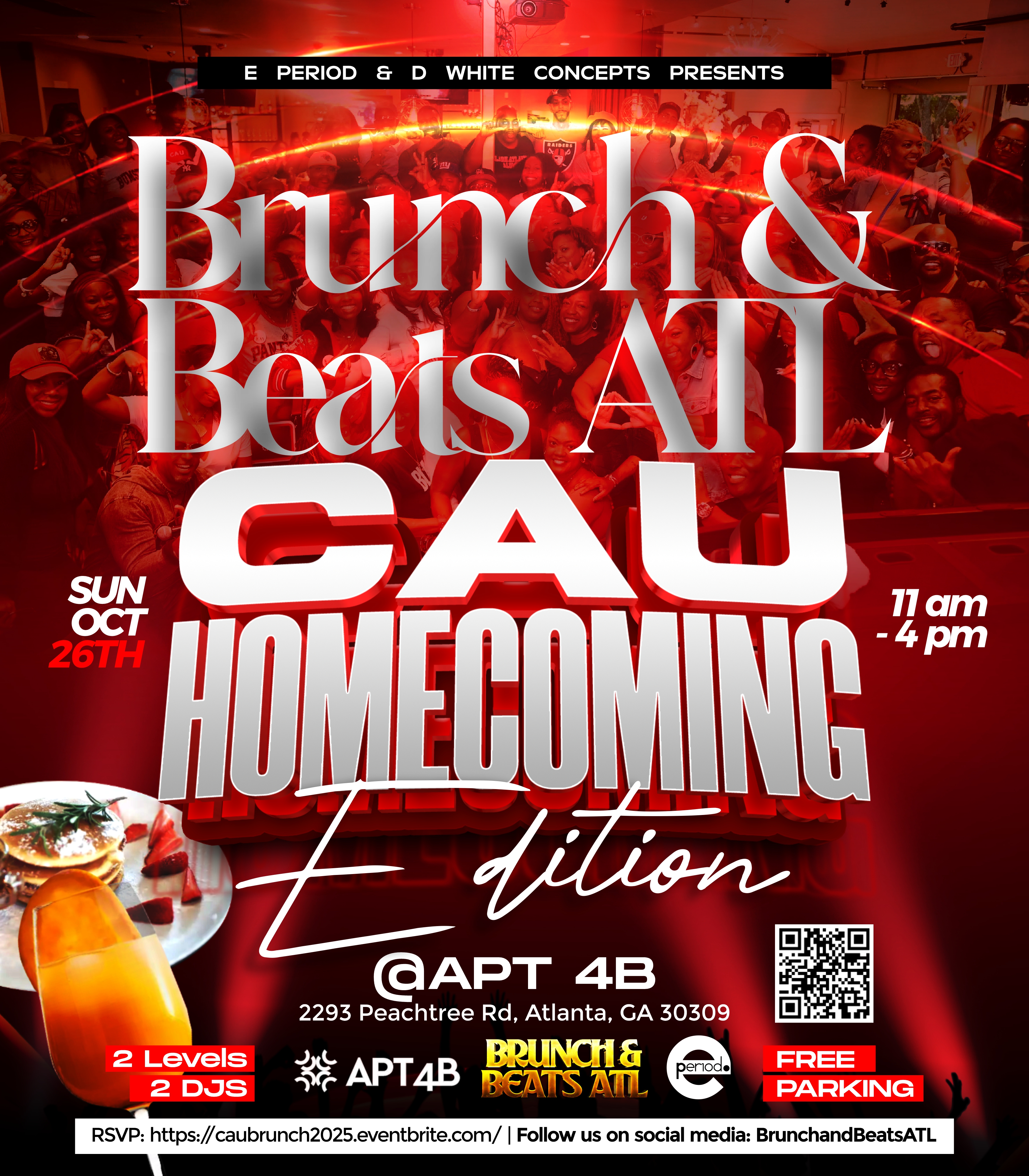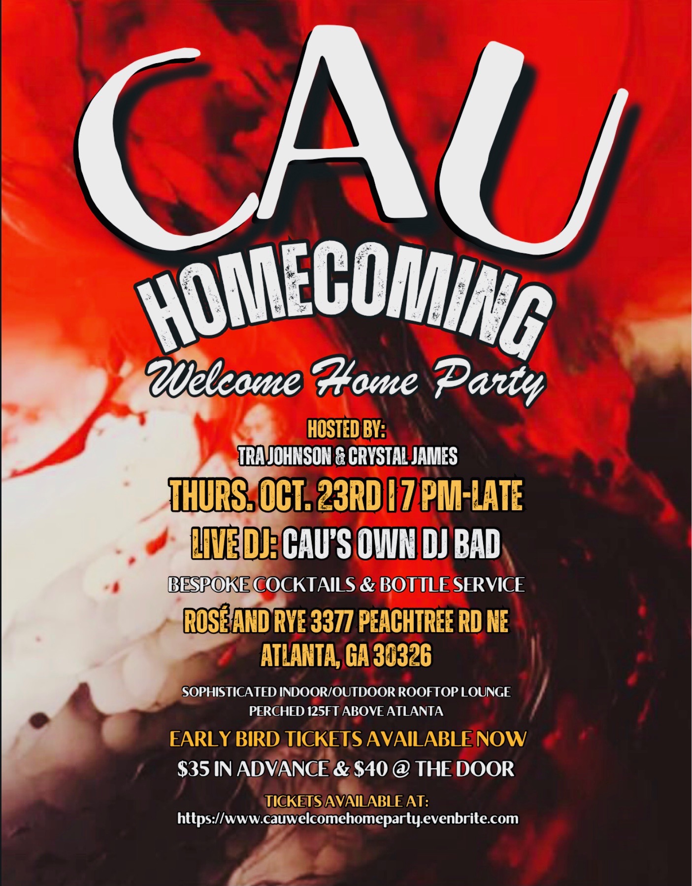 | | | | CAU WELCOME HOME PARTY AT ROSÉ AND RYE, HOMECOMING KICKOFF PARTY. DRESS TO IMPRESS. | | | | The Wonder Years Presents 174 Northside Drive, Atlanta, GA Clark Atlanta University Homecoming Weekend Hosted by Taiye The Wild Afrikan & Sir Paul DJ Mars • DJ Trauma • Mix Master David • DJ Supreme • DJ P For Real | | | | CAU Homecoming – We Brunch Different! The vibes are legendary every time we link up! Brunch & Beats ATL: CAU Homecoming Edition Sunday, Oct 26th | 11AM – 4PM APT 4B | 2293 Peachtree Rd, ATL 2 Levels. 2 DJs. 1 Epic Day. DJ Ill Will (Party Lounge) FREE Parking. FREE Energy. Same ATL Magic. Pull up, show out, and rep your alma mater like it’s STILL freshman year | | |