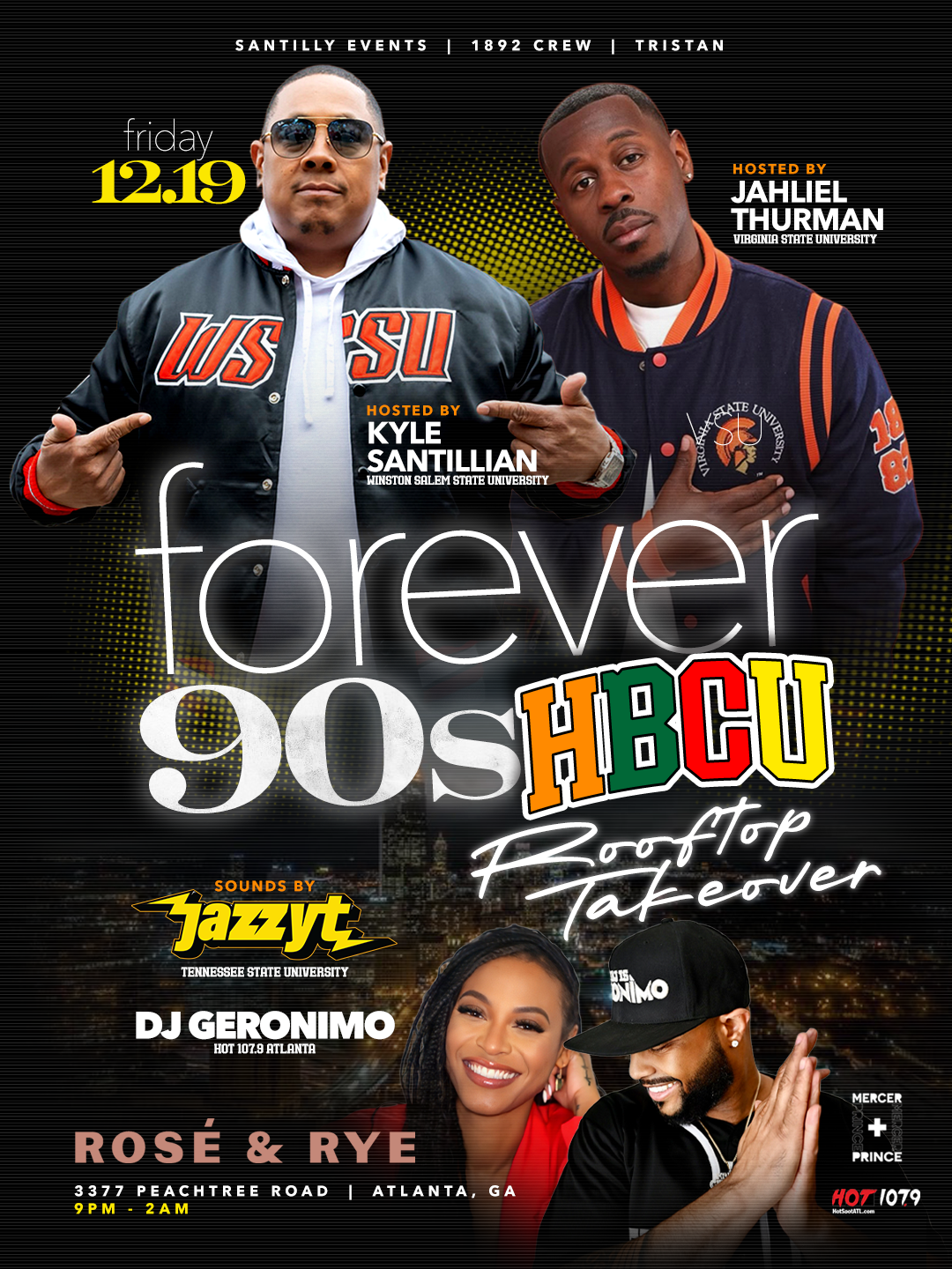 | "FOREVER 90s" Presents…The HBCU Rooftop Takeover! in Buckhead, Atlanta on December 19th! We're doing it for ALL HBCU Alumni & Friends at the Beutiful “Rose' & Rye” on top of the Colee Hotel! | | | | No matter what HBCU you attended, throw on your gear and pull up on us Friday Night, Dec 19th, Experience complimentary cocktails from “Mercer + Prince” as we take it back to “The Yard” for the evening! This event is perfect for those who LOVE Good music, HBCU vibes, turning up with friends, family and anyone looking sing along to great music from a classic era! From The Morning Hustle.... Its all hosted by Winston-Salem State Alumni, Kyle Santillian & by Virginia State Alumni, Jahliel Thurman Hot 107.9's own & Tennessee State Alumni, DJ Jazzy T and Hot 107.9's own, DJ Geronimo! Please secure your spot quickly! |