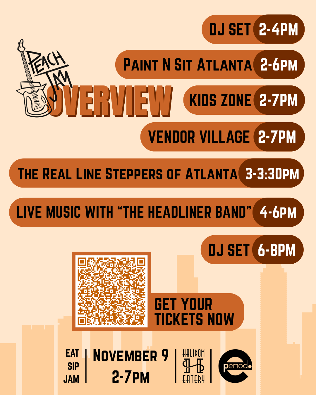 Powered by Halidom Eatery & E Period, LLC Atlanta, the vibe is set — it’s time for Peach Jam Festival at Halidom Eatery! Join us for a full day of music, food, family fun, and community connection. 🎶 Live Performances Headliner Band bringing the soul, funk, and energy you’ve been waiting for DJ Genius on the 1s & 2s, keeping the crowd moving all afternoon The Real Line Steppers of Atlanta