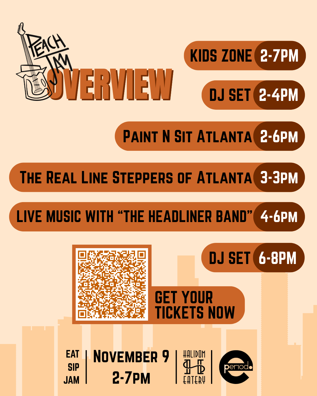 Powered by Halidom Eatery & E Period, LLC Atlanta, the vibe is set — it’s time for Peach Jam Festival at Halidom Eatery! Join us for a full day of music, food, family fun, and community connection. 🎶 Live Performances Headliner Band bringing the soul, funk, and energy you’ve been waiting for DJ Genius on the 1s & 2s, keeping the crowd moving all afternoon The Real Line Steppers of Atlanta