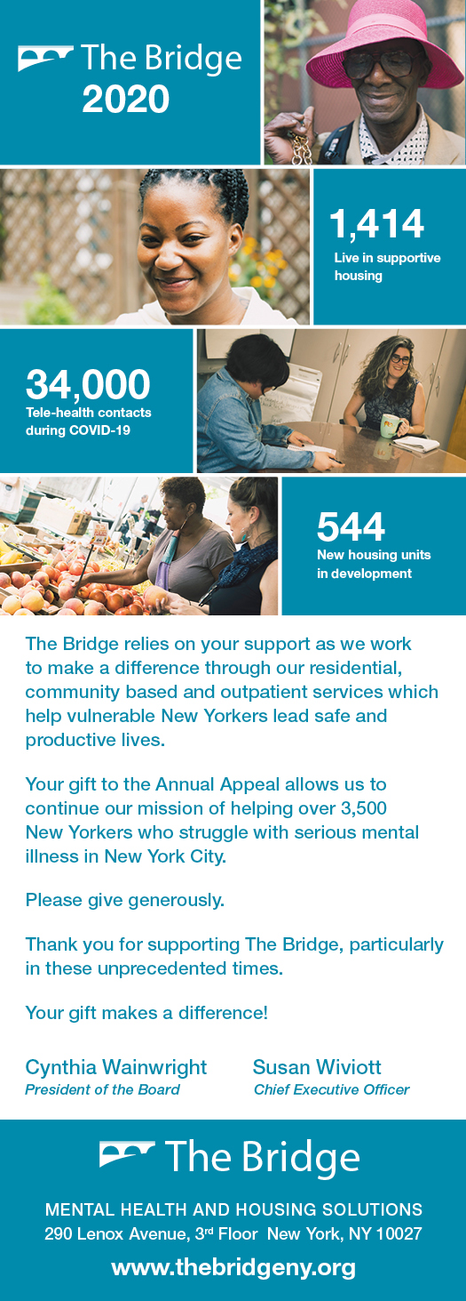 This year The Bridge has accrued significant costs during the COVID-19 pandemic trying to keep our clients and staff safe and healthy. We need your help now more than ever to ensure that The Bridge can continue to provide essential services to 3,500 New Yorkers.