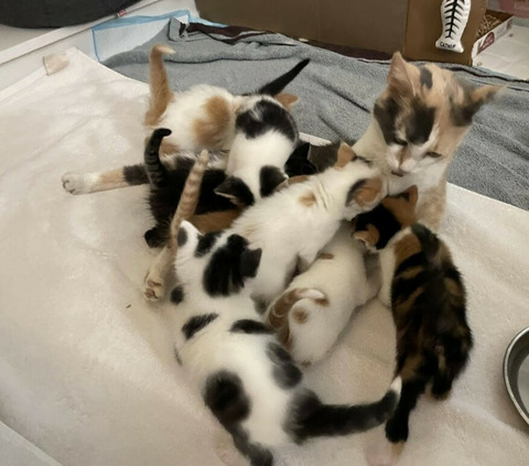 "When she first arrived at our home, she showed no sign of fear and greeted all two-legged family members with a quick leg rub and a few soft mews. By the time she gave birth she had gotten very comfortable with our family and was happy to have us nearby to witness the birth of her 8 kittens. She immediately took her new mommy role seriously and made sure all her babies were fed and cleaned, which was quite an undertaking with 8 hungry kittens and just 6 nipples. Since Tulip wasn’t able to feed them all at once, she fed them very frequently to ensure everyone got their turn, sometimes twice an hour, 24/7." |