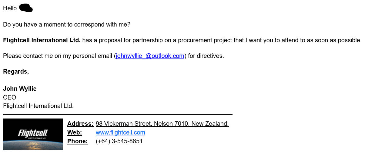 Please note we have been made aware of a scam email that is being circulated claiming to be sent from our CEO, John Wyllie. See below for the scam email being sent.