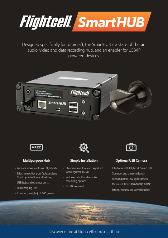 •	Records HD video, audio, and flight data •	Access point for USB/IP powered devices •	Aviation compliant Wi-Fi access point •	Integrated USB hub and ethernet switch •	Effective tool for flight optimization and compliance •	Dedicated SmartHUB Flight Viewer software •	Hardened internal removable SD card slot •	Fast charging USB-A port •	Integrates with the Flightcell DZMx •	Ability to connect with the new compact Flightcell Camera