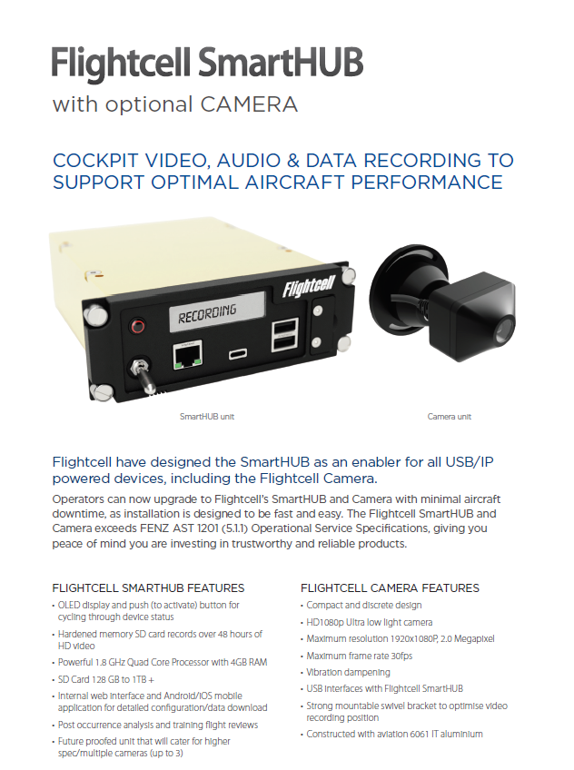 Flightcell SmartHUB & Camera | Flightcell are pleased to announce their new SmartHUB & Camera that are scheduled for release in early 2022. The SmartHUB will be an enabler for all USB/IP powered devices, including the new Flightcell Camera. The Flightcell SmartHUB and optional Flightcell Camera have been developed to exceed the FENZ Operational Service Specifications (ATS1201), specifically article 5.1.1 Aircraft Equipment. Whereby all rotorcraft that provide services to government agencies (including FENZ and DOC) must have equipped a cockpit video, audio and data recorder. While the FENZ directive states a cockpit recorder must be installed by 01 November 2021, Flightcell understand that operators may install at a later date within an agreed grace period if they can prove intent to comply with the FENZ directive. The SmartHUB is easy to install with various mounting options and does NOT require an STC. Additionally, the SmartHUB and Camera can be installed as Standalone Role Equipment under AC43-14 as a minor alteration. The SmartHUB delivers operators several key benefits: Recording device for video, audio, and flight data, which is an effective tool for post-flight analysis, flight optimisation, and training purposes Conforms with FENZ ATS1202 5.1.1 for cockpit video, audio and data recording USB hub and ethernet ports Hardened SD card storage for flight data and video/audio recording Standalone unit or can be paired with Flightcell's DZMx & DZMx PLUS for enhanced data transmission and capabilities Future capability of accommodating up to three cameras, installed in the cockpit, aircraft cabin and on the winch, all running off one SmartHUB USB charging points for laptops, tablets, mobile and other USB devices Optional WiFi access point