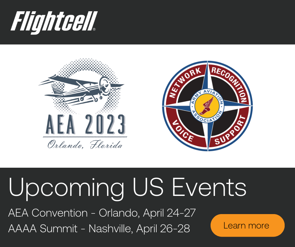Upcoming Flightcell Events AEA International Convention & Trade Show & Army Aviation Mission Solutions Summit | | | Flightcell is proud to be exhibiting at two events next week in the US. | | | | Flightcell is also exhibiting at the 2023 Army Aviation Mission Solutions Summit in Nashville, Tennessee. We will be showcasing all our product lines and demonstrate how they provide effective solutions to military operators. | | | | | | | |