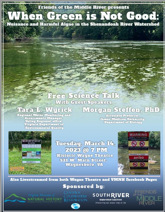 Our speakers will discuss differences and identification clues between “nuisance” algae and “harmful” algae that occur in rivers of the Shenandoah River watershed. DEQ will review the last six years of nuisance algae monitoring efforts. Dr. Steffen will explore how harmful algal blooms (HABs) are hazardous to humans, pets, and livestock. Both speakers will also discuss how to report suspected algal blooms to authorities for further investigation. To bring you this event, the Wayne Theatre, the Virginia Museum of Natural History and the Center for Coldwaters Restoration are working in conjunction with: Friends of the Middle River Friends of the Shenandoah River This event will also be live-streamed on the Wayne Theatre's Facebook Page and recorded. More info HERE!