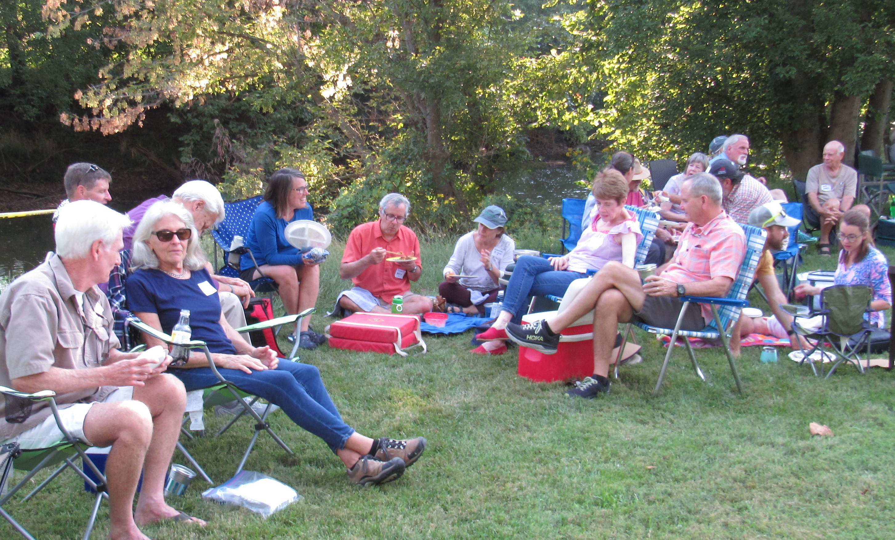 FOMR volunteers are a hardy, dedicated bunch! Look at all the team photos HERE. | | | | | After cancelling our original date for FOMR's Friends Fest Picnic due to weather, we gathered for our first in-person picnic in 2 years, at the Websters’ Middle River property, on September 18th—a beautiful afternoon. Despite the reschedule,115 people joined us for the picnic, receiving door prizes of a Ball Corporation aluminum reuseable/recyclable cup and Flow Alkaline Spring Water. The event began with a Gear Swap, where members were able to sell/swap their boating/river/recreational equipment, and a silent auction. Folks then enjoyed delicious BBQ and cole slaw catered by 1 Tribe Farm, to supplement their picnic, while sitting on blankets and chairs along the river. After acknowledging our amazing volunteers and sponsors, Board Chair Nancy Owens drew the winning raffle tickets for various wonderful prizes, including an inflatable standup paddle board and kayak. Thanks to all who made this long-overdue fun event happen both by volunteering or attending! Check out more of the party's photos HERE!