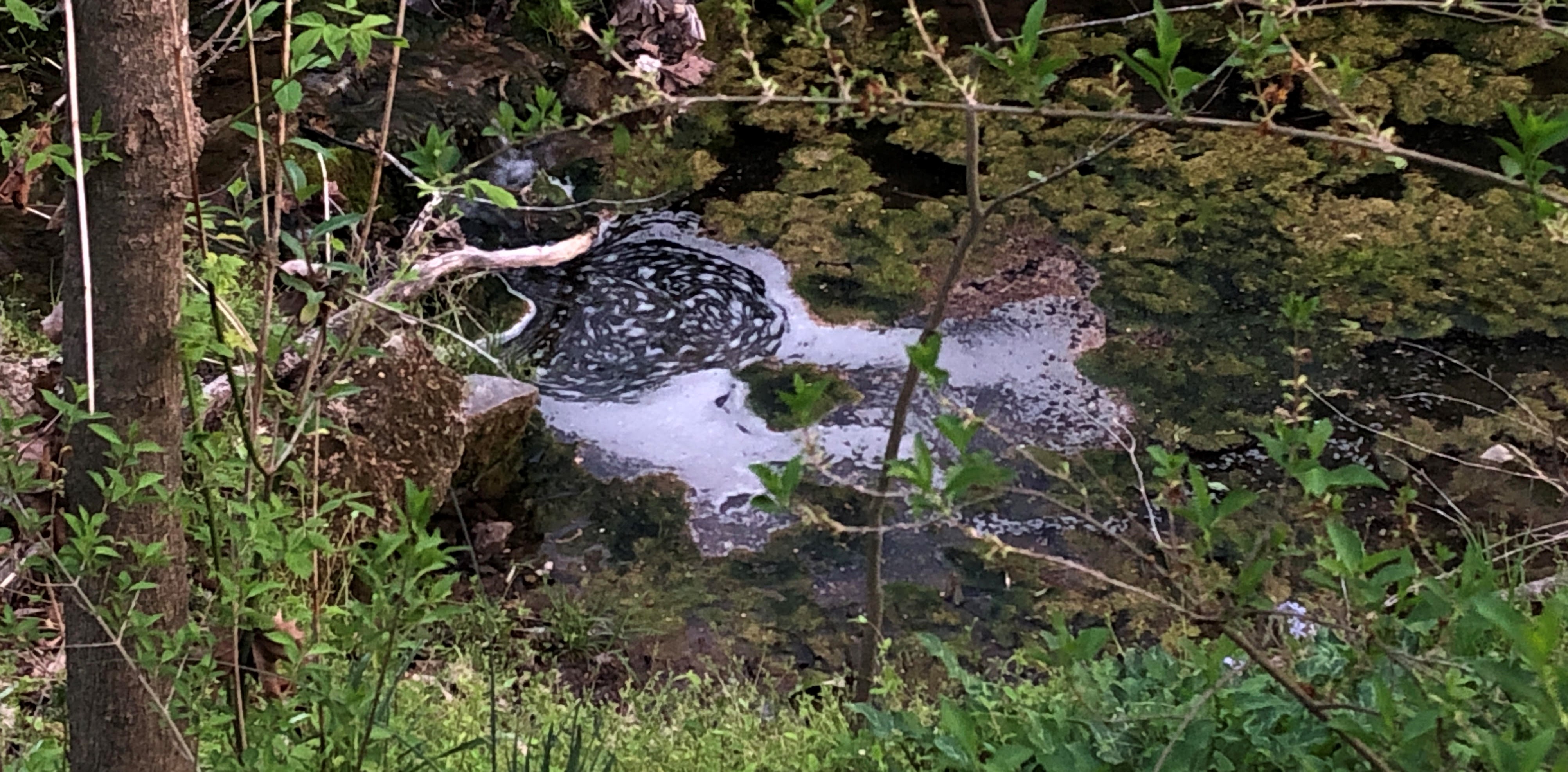 "The foam...is most likely naturally occurring, the result of the decay of organic matter that allows air to get trapped in the water column. After undergoing turbulence, water bubbles form creating natural foam and subsequent release of surfactants. Naturally occurring foam won't feel slippery when you rub it between your fingers, and it'll have more of an earthy smell. Natural foam shows up pretty often this time of year, especially when we get a little warm spell and some rain. The foam could also be the result of discharge from a point source such as a wastewater treatment plant or another source of discharge or runoff. Typically, if it's a detergent issue, the foam will feel slippery and likely have an odor. Brown discoloration is sometimes caused by sediment and/or pollutants mixing in with the foam."