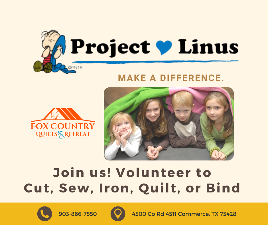 Join us to sew, quilt, and bind quilts to donate to Project Linus for their efforts to give children a quilt when in need.
