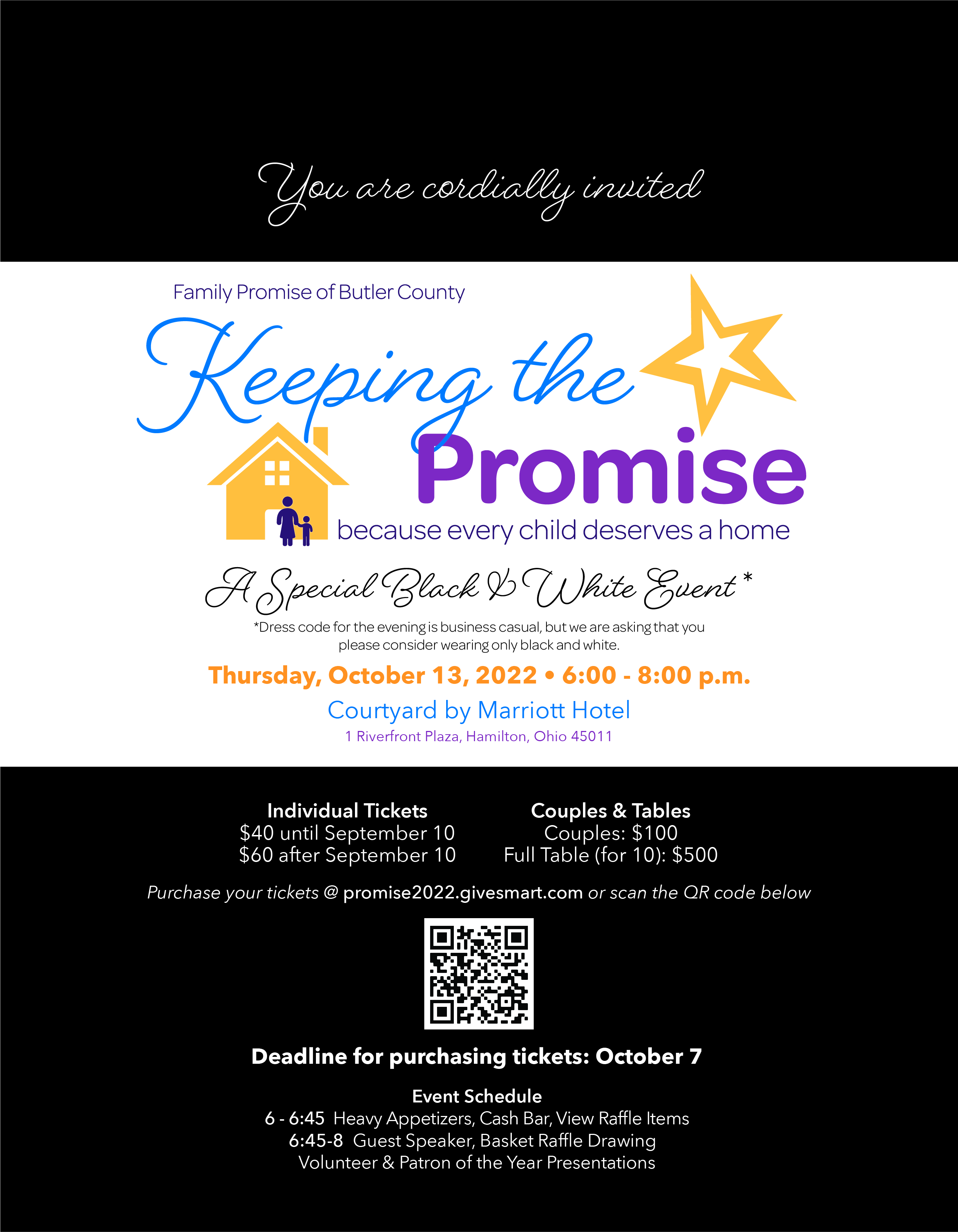 Time is flying! ⏰ Our annual Keeping the Promise event is TWO WEEKS FROM TODAY! We need all ticket 🎟️ orders to be complete by Friday, October 7 so we can be sure to have plenty of food 😋 for everyone. If you're still waiting to get your tickets, the time is now. ⏳ Please make plans to join us for this special evening and help us give children and their families in Butler County the tools they need to secure safe and sustainable housing. 🏠💙💛💜 |