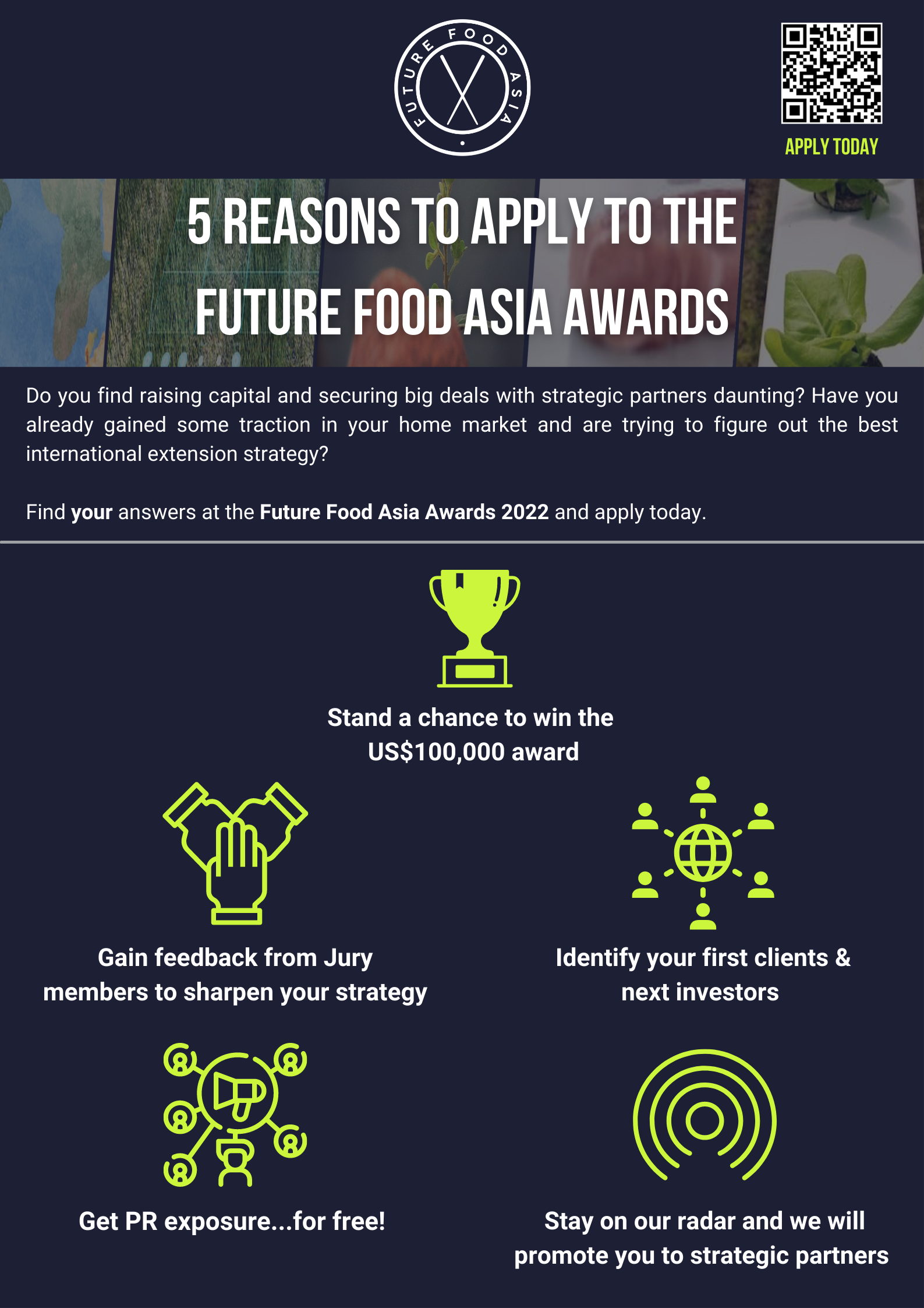 Shortlisted startups will get a chance to win the USD$100,000 grand prize, along with two additional awards announced by this year’s partners, Cargill and Thai Wah: The Cargill Good for Food Award and The Thai Wah Prize for a Circular Bio-Economy. Finalists will also get the opportunity to present to an international audience of investors and multinational corporations.