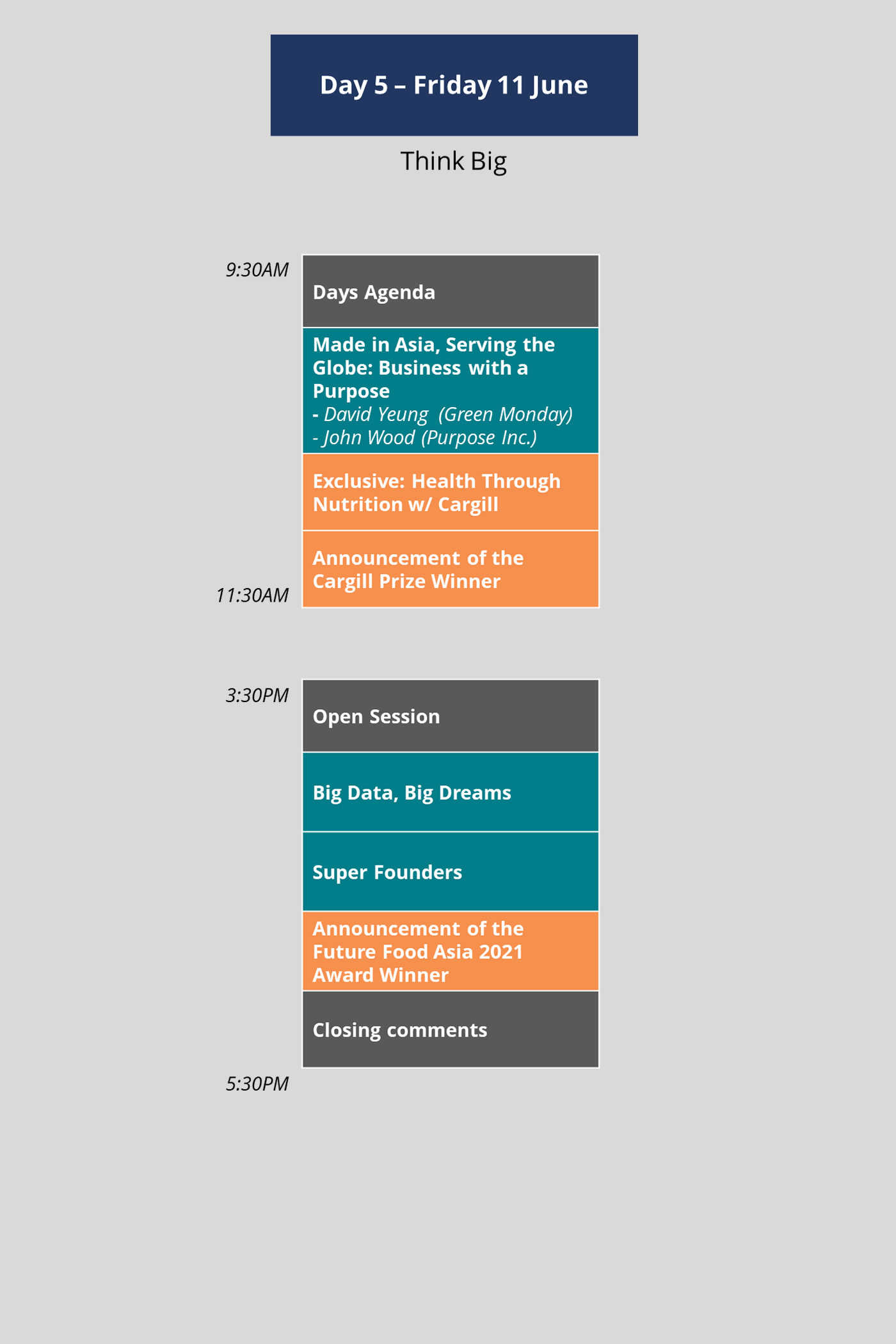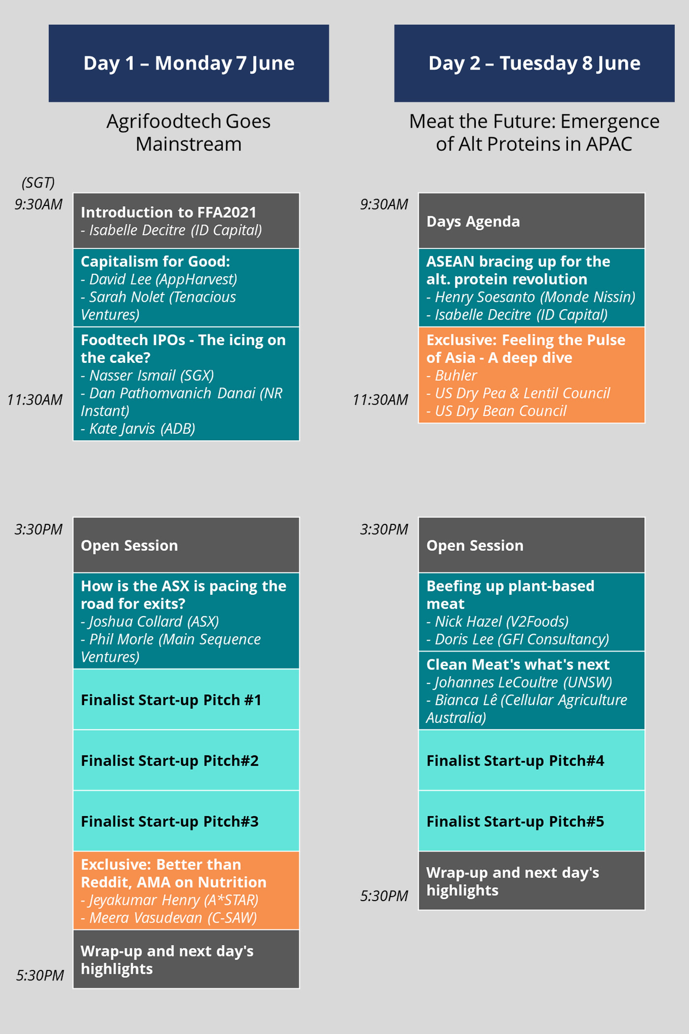 | Was this email forwarded to you? Click here to join our community and follow make sure you follow us on LinkedIn | | | Future Food Asia 2021 promises to be power-packed with thought provoking discussions, inspiring innovation showcases and âyou heard it here firstâ exclusive moments. Weâre happy to give you a sneak peek into the agenda across the 5 days and introduce more leaders and pioneers from the industry who join our growing list of speakers. | |