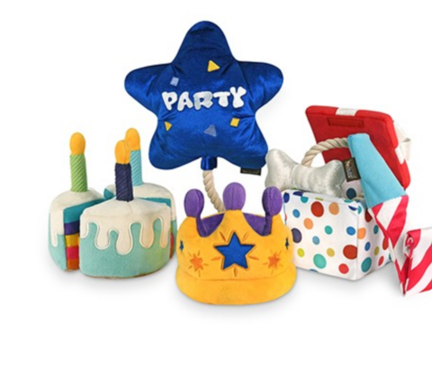 Is your dog’s "gotcha day" or his birthday coming up? Or maybe it would just be a fun diversion for the kids to pretend it’s the dog’s birthday and have a little party!! These adorable funny toys include a crown (complete with little loops you can feed some string through and actually tie it to your dog’s head for a photo op), a toy that looks like a mylar star-shaped balloon (on a rope), a noisemaker that does make a little noise and extends as if you’re blowing it, a present with a bone on a rope inside, and a hilarious stuffed birthday cake with candles, with slices that are attached together with velcro. Combine this with a frozen yogurt or doggy gelato for the dog and a takeout pizza from Ottos or Red Sauce for the kids, and a good time will be had by all!