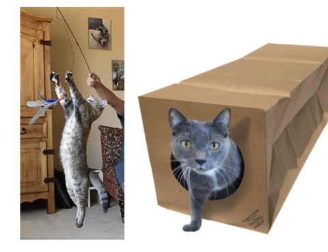 Now's the chance for kitties to get the playtime they deserve! I know they're enjoying extra lap time, and that's nice for us too, as that sort of activity helps our stress level. But the two things cats often don't get enough of is interactive play and enrichment. Interactive play is very important, as it simulates hunting behavior which is so very hardwired in cats. Like us, they need exercise to keep healthy hearts, maintain muscle tone, work the calories off, and generating good endorphins that positively affect mood and lower stress levels. The best toy in the store for cats is Da Bird - I'm sure many of you know it, but those who don't should try it - its super long string allows big playtime (long enough for seniors to play while seated), and its feather end is designed to spin when it travels through the air, truly looking like a bird flying through your living room. Pro tip: immediately reward the best leaping catch with a great meaty treat to supercharge the game. So satisfying for them to hunt, catch, kill and eat their prey! The other important element is enrichment, meaning novel items or activities that pique their curiosity. Things they can investigate, and which might stimulate solitary play. Many things around the house can be enrichment - a cardboard box with little and big holes cut into it, a pile of paper from the shredder, shopping bags, a pile of lightly crumpled tissue paper, a piece of furniture from another room moved into the middle of the living room, etc. Just recycle these materials when they grow tired of them and use your creativity to come up with something new. Our favorite toy for solitary (or interactive) play is the Hide and Sneak paper bag cat tunnel. This collapsible tunnel is remarkably sturdy and durable. Otis has belly flopped right onto it and we just popped it back into shape. It's a great game to use a wand toy in and around the tunnel. It provides satisfying loud crinkle noises and provides a quiet place to retreat after they play themselves out. |