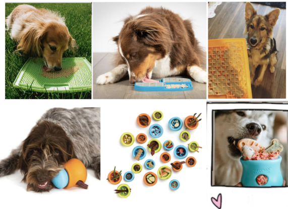 Lickimats are flat, easy to clean rubbery mats that have a textured surface, and Topples are tough cup-shaped rubber toys that have rubbery prongs inside (Toppls come with a one time replacement guarantee).