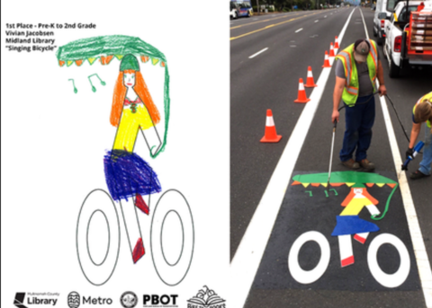 May is Bike month! Bike to Books Coloring Contest: Open to students from Pre-K to 12th grade. Their design could be installed on Portland's streets! Coloring contest here. Learn all about the Bike to Books programs here