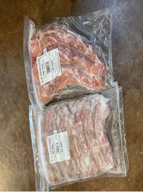 Some of the very best teeth cleaners are chicken necks, duck necks and turkey necks (suiting 3 sizes of pet). It’s very true that COOKED poultry bones are very dangerous to dogs, as they can be sharp and splintery. Raw necks are different. The bones in the neck are small and crunchy and surrounded in connective tissue and cartilage. They’re safe to chew through and very supportive nutritionally. Our favorite holistic vet recommends three raw poultry parts a week in place of commercial joint supplements, due to the high levels of natural glucosamine and chondroitin and other joint supporting nutrients in the collagen and connective tissues of bone in a highly bio-available state.. As they eat them, their teeth and gums are also getting a great flossing! The enzymes in the raw meat also help to fight bacteria in the mouth. Dogs love them, and many cats love chicken necks too (either whole, which is often a young cat’s game, or in 1/2 inch slices) . This was our cat Otis’ favorite treat! Check out the video in this blog post and turn on the sound! CRUNCH CRUNCH! Please Note: if you're after chicken necks, you might have to look for them at New Seasons in the meat dept. as our vendors have recently discontinued them. I've gotten them there in the past by asking the butcher. I cut them up into 1/2" pieces, freeze them on a tray, put them in a ziplock and thaw them as I need them in a little bowl of water. Necks have another nice benefit for dogs with anal gland issues – several chicken necks a week can make nice firm stools that help to express the anal glands more effectively.