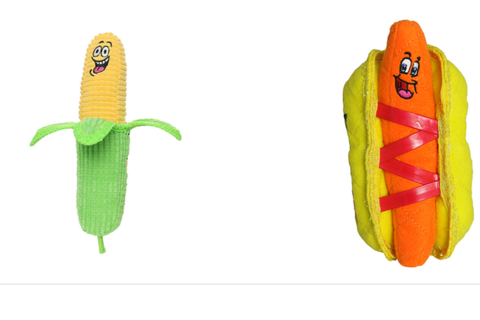 | | TUFFY'S CORN AND HOTDOGS! These hilarious toys for small or medium dogs feel so tough! No soft toy is indestructible, but Tuffies does their best to make tough toys that stand up to abuse: Each toy is made with 4 layers. 2 layers are made of 600 D industrial grade luggage material, 1 layer of plastic coating, and the other layer is made of soft fleece on the outside. All of these layers are sewn together to make one super strong layer of material. Each toy is sewn together with 2 layers of cross stitching and then 2 layers of linear stitching. After the toy is sewn together an additional piece of black trim is added to cover the four rows of stitching. This extra piece of black trim is sewn with 3 linear stitches to give the product a total of 7 seams! (Some of your dogs will of course get through them eventually.)These toys are machine washable (air dry) and float. The hotdog comes out of its bun, and the corn can be shucked as well. We try to find the most durable toys we can, as the less flimsy it is, the less likely it is to wind up in a landfill! |