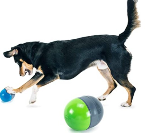 THIS SUPER FUNNY TOY KEEPS THEM MOVING!Pet Safe’s “Ricochet” dog toy has two sturdy rubber balls. As your dog plays with one of the interactive paired toys, a fun and exciting squeak sound is heard from the other toy. When your furry friend investigates the second toy, the sound bounces back to the first toy. Your dog will love trying to find the squeaky sound. While not a chew toy, the Ricochet is durable enough for intense play. Change up the game by hiding one of the toys behind furniture or in a nearby room. The toys have a range of up to 30 feet. When your dog is done for the day, it will automatically turn off after 60 minutes of non-interaction to conserve the battery life. The moving squeak provides a fun puzzle for your dog as the sound is never where he expects it, and you will love knowing your dog is staying active! These balls are sturdy, but supervised play is important with products that contain batteries.See them in action here with a review here If it were me, at the end of the game I'd trade the balls for a favorite squeaky toy that they can really chomp down on, like the Mighty Squeaks below. |