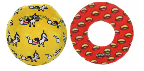 | | TUFFY'S MIGHTY SQUEAKS! Tuffy's toys have made some hilarious and durable new toys! These squeaking balls (2 sizes, 4" & 6") and VERY squeaky rings (10" and they squeak no matter where you squeeze them) have no stuffing at all. The fleece they cover the toy with is a non woven fleece that is not as easily punctured by a dog’s teeth. This protects the plush from being ripped or torn easily, then inside there’s a plastic squeaking core, covered with luggage grade material sewn together and reinforced with webbing and loads of seams. If your dog gets the fleece off, they say it's like a whole new toy to play with. Remember no toy is indestructible. Please be a responsible parent and stay close when your dog is playing with any dog toys, and if pieces come apart, or the dog gets down to the plastic core, please dispose of them. The patterns are hot dogs, and unicorns that fart rainbows. Check them out here