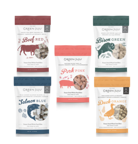 | GREEN JUJU FREEZE-DRIED COMPLETE MEALS!This complete and balanced, limited-ingredient raw diet starts with responsibly sourced, high-quality proteins, including nutrient-rich organ meat. Then they add a dark, leafy green and kelp. No grains, gluten or fillers. No synthetic vitamins or minerals. Only nourishing, natural ingredients for healthy, happy, energetic pups. If you feed your dog a kibble diet, you can also sprinkle these delicious freeze-dried nuggets on top to replace some of the important amino acids that dogs need that are often damaged by high heat cooking. Another Great topper for picky dogs! |